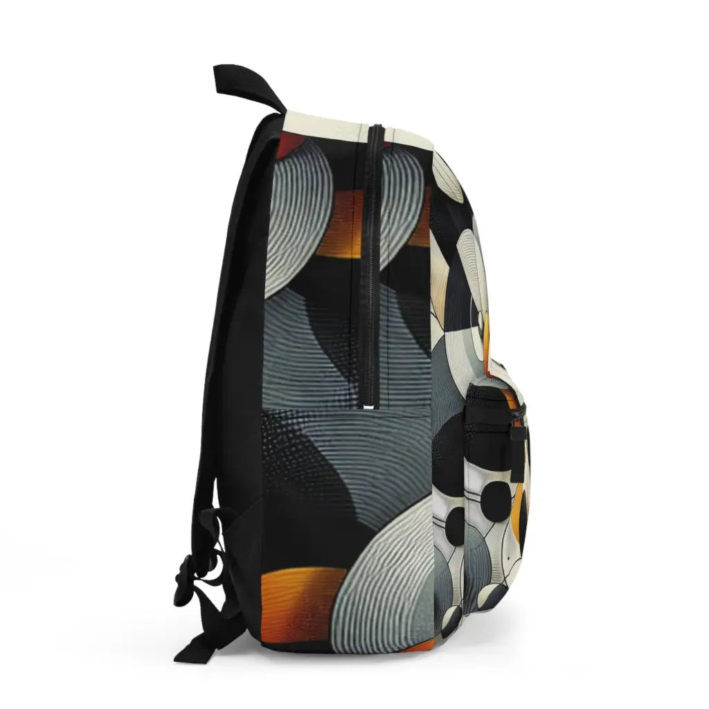 Dynamic abstract composition of overlapping circles and arcs in black, white, and orange hues. Intricate patterns and lines radiate outward, creating a sense of movement and depth against a textured background. A harmonious blend of geometry and color, evoking energy and balance. Introducing the ultimate backpack for fashion-forward adventurers! Our backpack boasts a striking textile design that will make a statement wherever you go. With its durable construction and spacious compartments, it is perfect for carrying all your essentials. Get ready to turn heads and stay organized with our backpack. #textiledesign #backpack #fashionforward #adventure #durable #spacious #statementpiece #organized #essentials #travel #explore