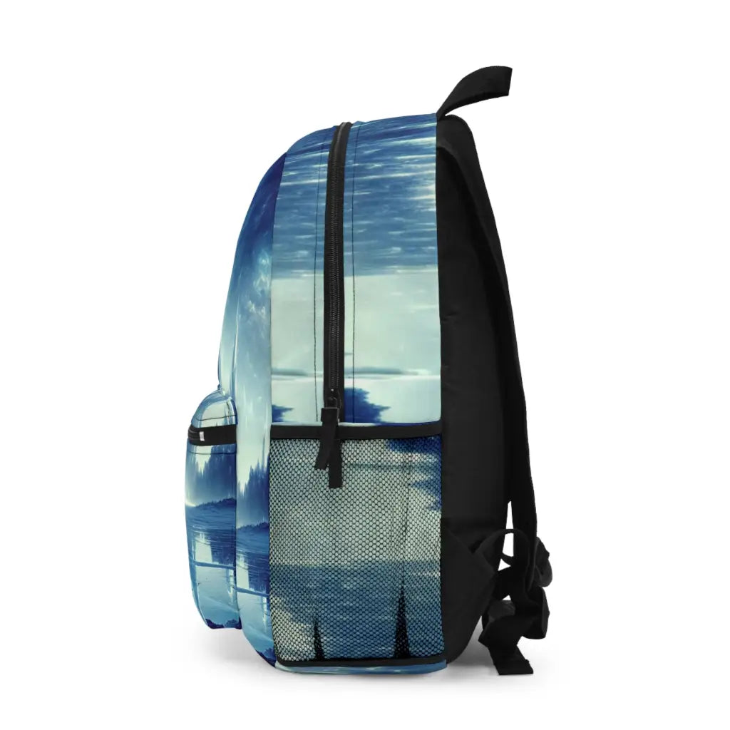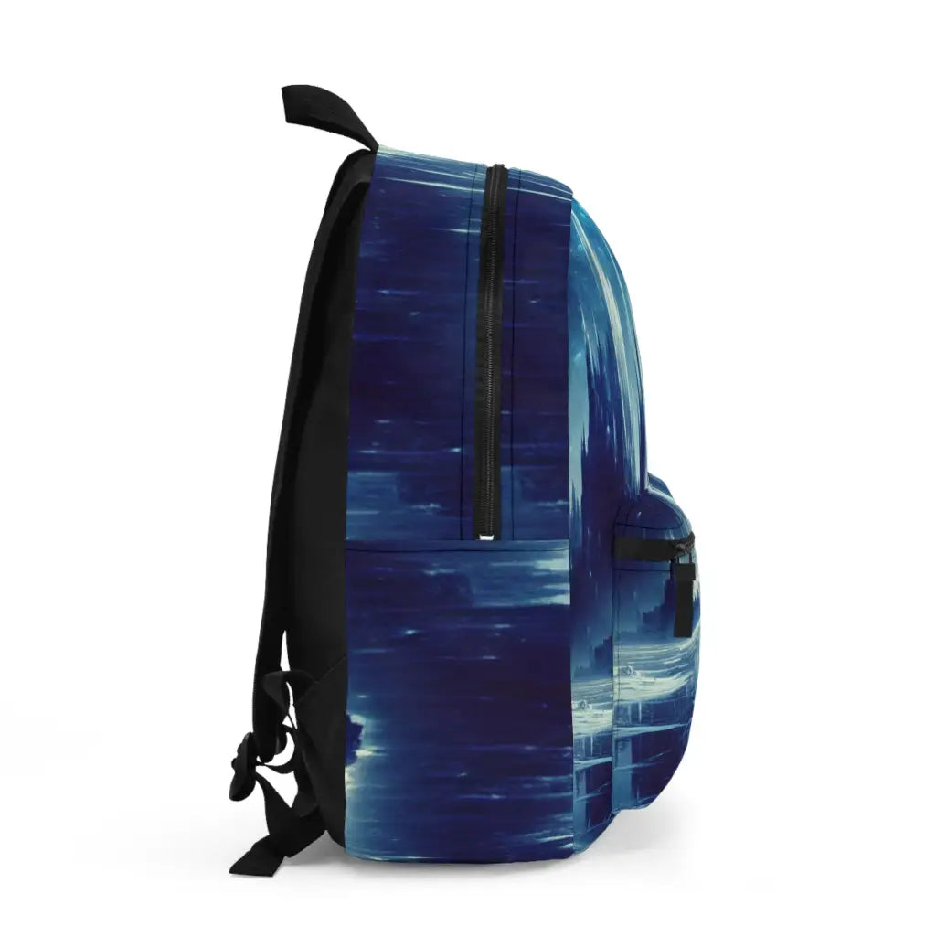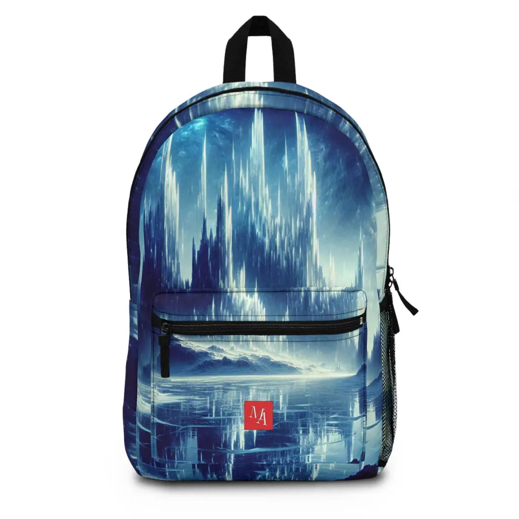 A towering, ethereal structure rises amidst an icy landscape, bathed in luminous blue light beams, beneath a starry twilight sky. The scene merges surreal fantasy with cosmic wonder, creating a mesmerizing contrast between rugged ice formations and the majestic, otherworldly spires reaching skyward. Introducing the ultimate backpack for fashion-forward adventurers! Our backpack boasts a striking textile design that will make a statement wherever you go. With its durable construction and spacious compartments, it is perfect for carrying all your essentials. Get ready to turn heads and stay organized with our backpack. #textiledesign #backpack #fashionforward #adventure #durable #spacious #statementpiece #organized #essentials #travel #explore