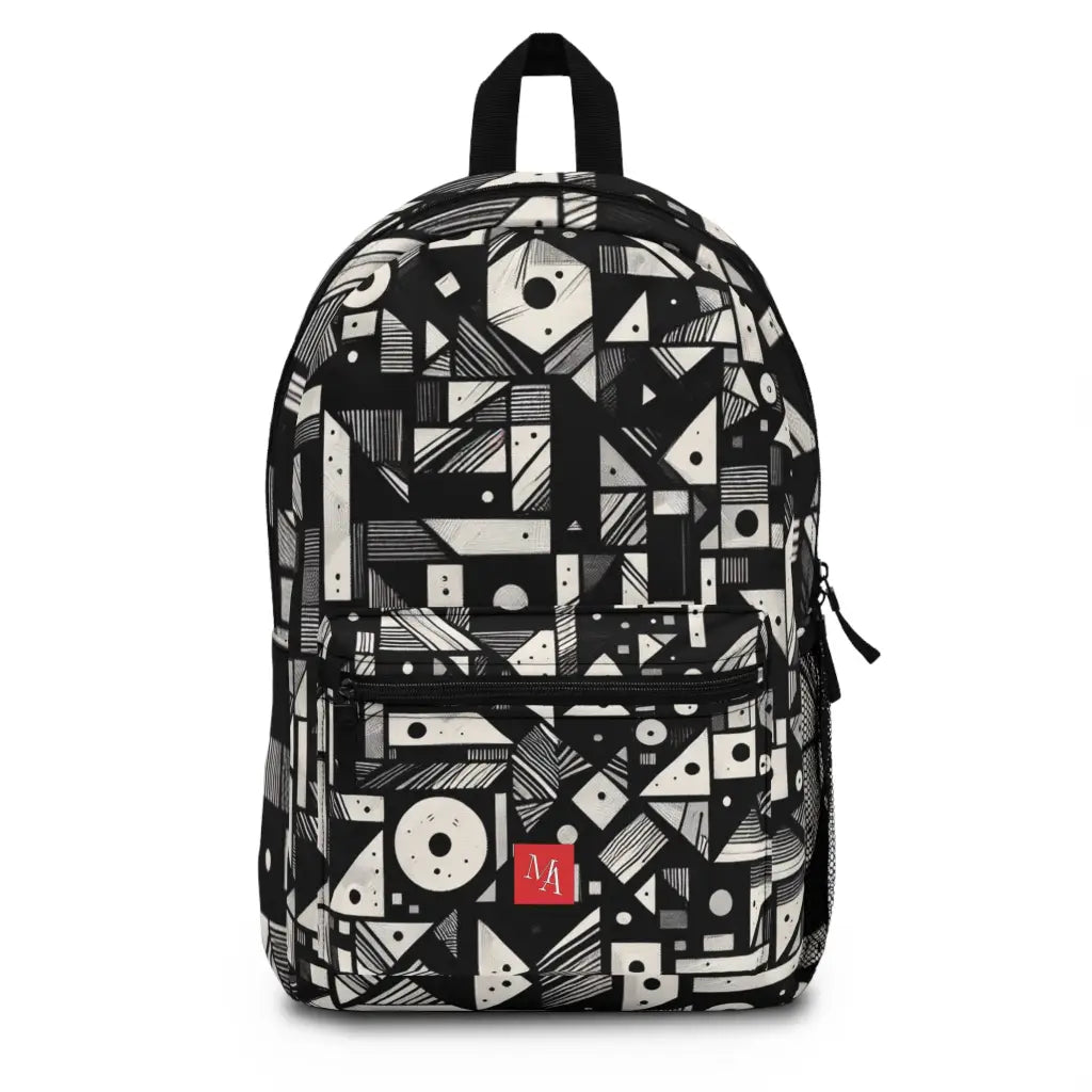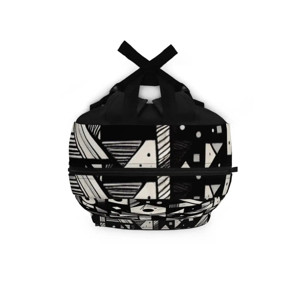 This image features a captivating tapestry of white geometric shapes intricately scattered against a deep black background, creating a dynamic, mesmerizing constellation of abstract forms. Introducing the ultimate backpack for fashion-forward adventurers! Our backpack boasts a striking textile design that will make a statement wherever you go. With its durable construction and spacious compartments, it is perfect for carrying all your essentials. Get ready to turn heads and stay organized with our backpack. #textiledesign #backpack #fashionforward #adventure #durable #spacious #statementpiece #organized #essentials #travel #explore