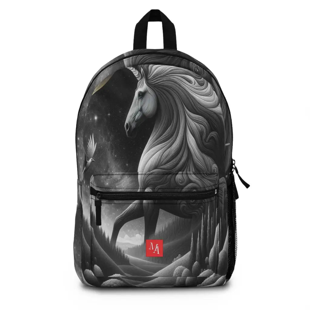 A majestic unicorn with a vibrant, swirling mane of rainbow colors gallops through an enchanting landscape under a crescent moon, blending fantasy and nature with mesmerizing celestial patterns and flying birds, creating a dreamlike harmony. Introducing the ultimate backpack for fashion-forward adventurers! Our backpack boasts a striking textile design that will make a statement wherever you go. With its durable construction and spacious compartments, it is perfect for carrying all your essentials. Get ready to turn heads and stay organized with our backpack. #textiledesign #backpack #fashionforward #adventure #durable #spacious #statementpiece #organized #essentials #travel #explore