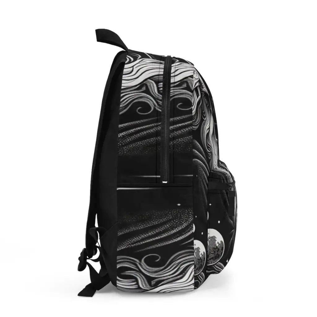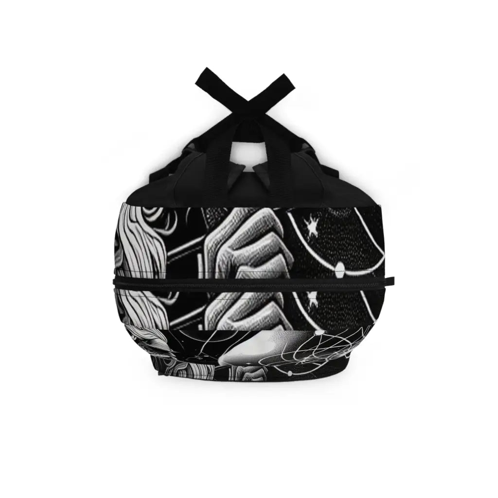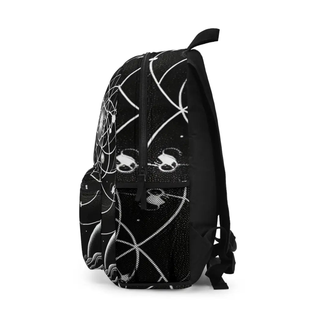 An ethereal wizard orchestrates cosmic orbits, merging mysticism with science. Intricate, swirling lines form a celestial tapestry, while open books suggest ancient wisdom. The monochromatic palette accentuates the celestial grandeur, evoking a sense of timeless wonder and the universe's mysteries. Introducing the ultimate backpack for fashion-forward adventurers! Our backpack boasts a striking textile design that will make a statement wherever you go. With its durable construction and spacious compartments, it is perfect for carrying all your essentials. Get ready to turn heads and stay organized with our backpack. #textiledesign #backpack #fashionforward #adventure #durable #spacious #statementpiece #organized #essentials #travel #explore