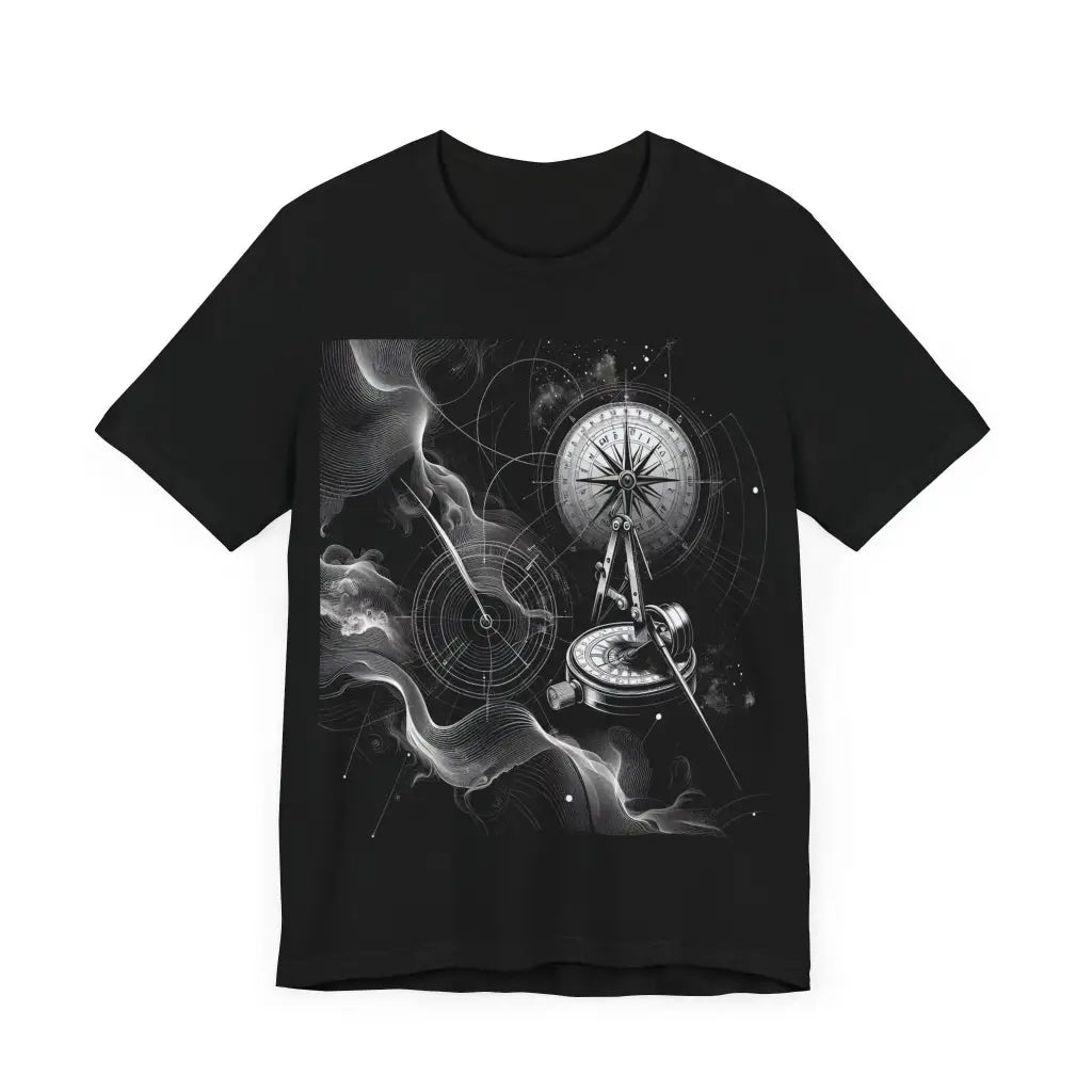A mesmerizing blend of celestial geometry and timepieces, this artwork features intricate mechanical designs amidst swirling cosmic waves, evoking a sense of timeless exploration and cosmic wonder.. This classic unisex jersey short sleeve tee fits like a well-loved favorite. Soft cotton and quality print make users fall in love with it over and over again. These t-shirts have-ribbed knit collars to bolster shaping. The shoulders are tapered for a better fit over time. Dual side seams hold the garment's shape for longer.