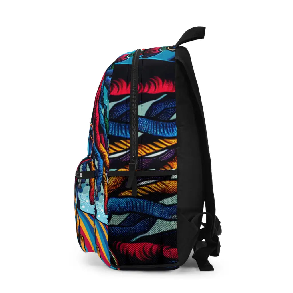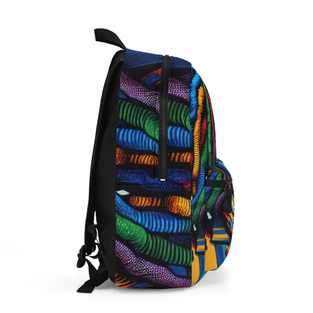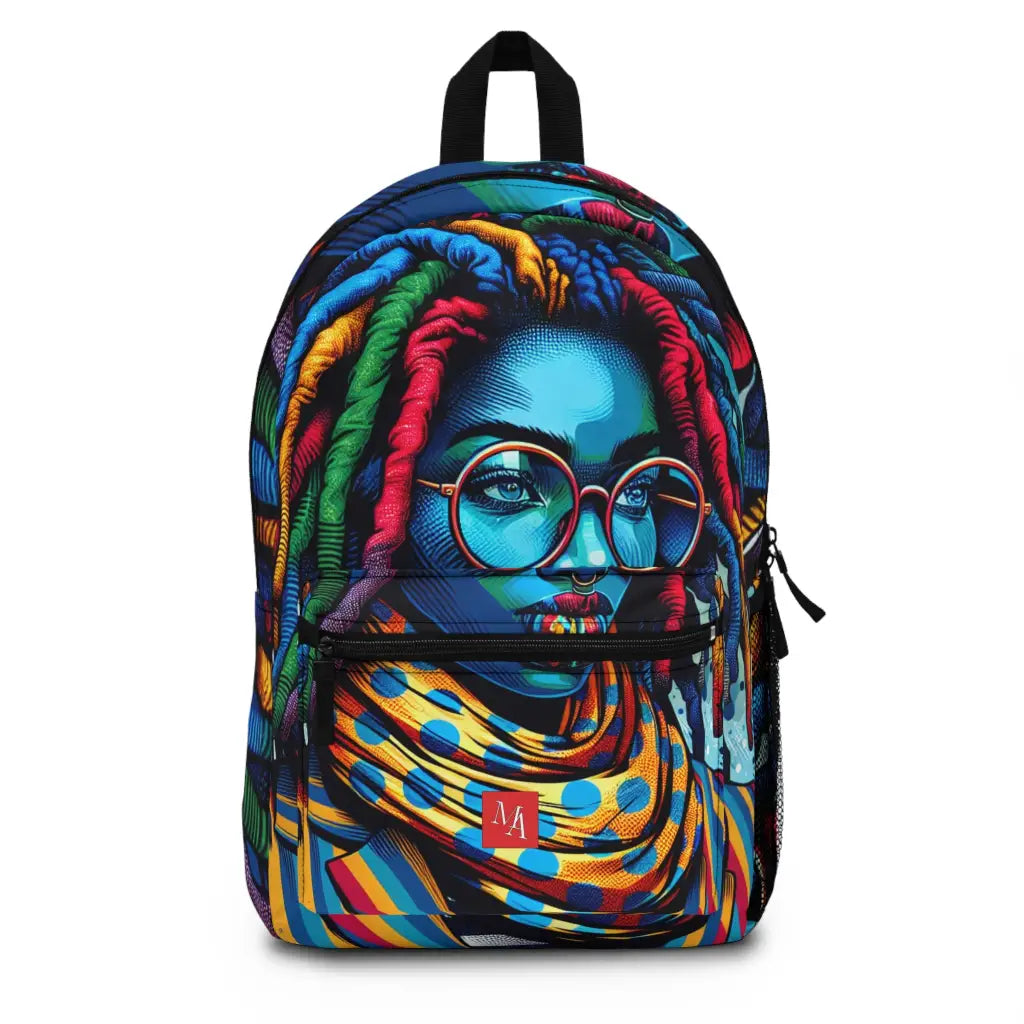 This vibrant portrait bursts with creativity, featuring multicolored dreadlocks and a kaleidoscopic face. The striking use of pattern in the polka-dotted scarf and striped attire enhances the visual dynamism, while bold glasses add a modern twist, making it a captivating fusion of style and color. Introducing the ultimate backpack for fashion-forward adventurers! Our backpack boasts a striking textile design that will make a statement wherever you go. With its durable construction and spacious compartments, it is perfect for carrying all your essentials. Get ready to turn heads and stay organized with our backpack. #textiledesign #backpack #fashionforward #adventure #durable #spacious #statementpiece #organized #essentials #travel #explore
