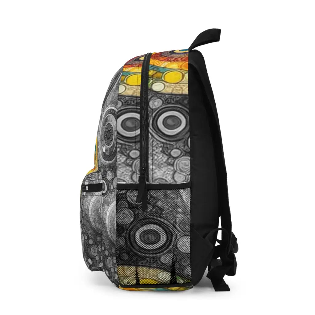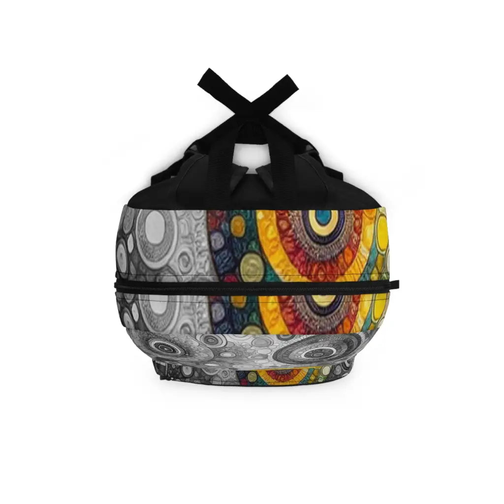 This vibrant image features an intricate tapestry of kaleidoscopic circles, seamlessly blending warm and cool hues. Each circle is uniquely detailed with geometric patterns, creating a mesmerizing cosmic dance of colors and shapes, evoking a sense of endless, dynamic movement across the canvas. Introducing the ultimate backpack for fashion-forward adventurers! Our backpack boasts a striking textile design that will make a statement wherever you go. With its durable construction and spacious compartments, it is perfect for carrying all your essentials. Get ready to turn heads and stay organized with our backpack. #textiledesign #backpack #fashionforward #adventure #durable #spacious #statementpiece #organized #essentials #travel #explore