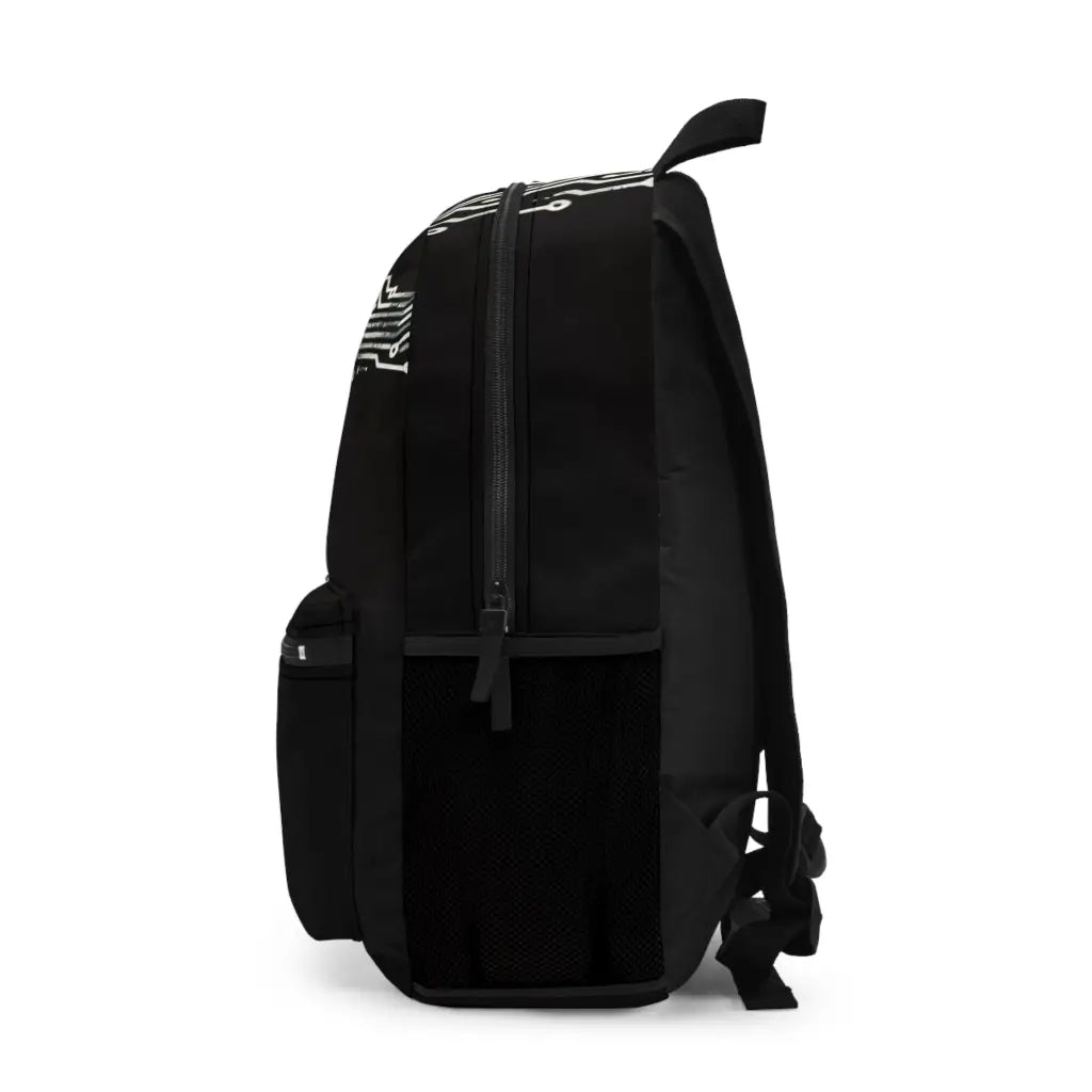 A circuit-like figure forms a humanoid shape against a dark background, blending technology with human imagery. The glowing blue pathways evoke the fusion of digital and organic, symbolizing connectivity and innovation. Introducing the ultimate backpack for fashion-forward adventurers! Our backpack boasts a striking textile design that will make a statement wherever you go. With its durable construction and spacious compartments, it is perfect for carrying all your essentials. Get ready to turn heads and stay organized with our backpack. #textiledesign #backpack #fashionforward #adventure #durable #spacious #statementpiece #organized #essentials #travel #explore