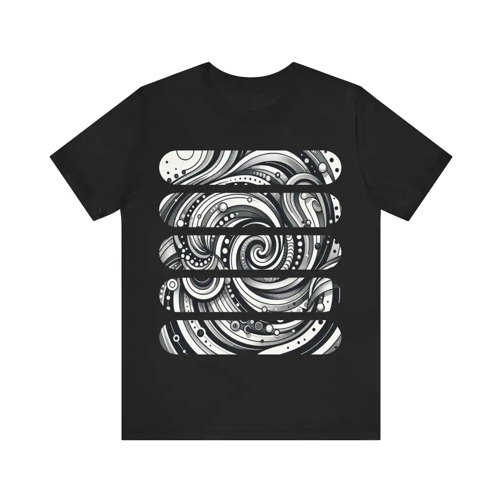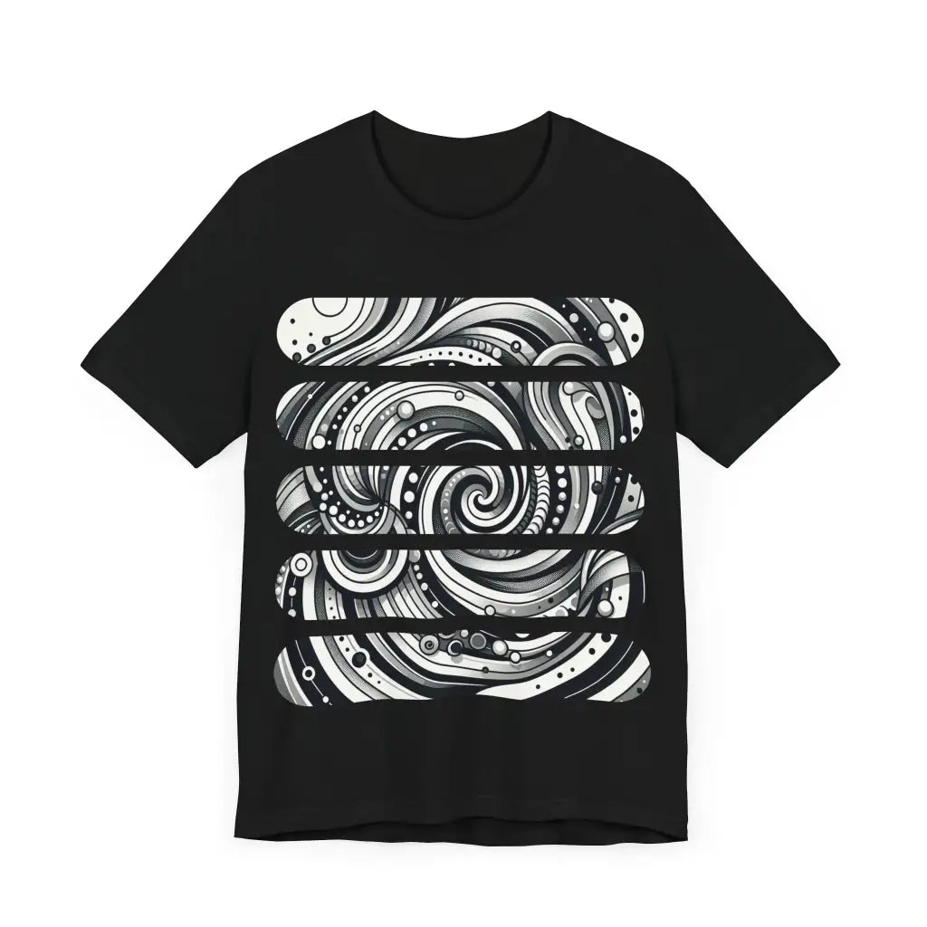 Dynamic abstract artwork with swirling black and white patterns, dotted and striped elements create depth and motion. The design is segmented into horizontal ovals, adding a unique rhythm and flow to the composition.. This classic unisex jersey short sleeve tee fits like a well-loved favorite. Soft cotton and quality print make users fall in love with it over and over again. These t-shirts have-ribbed knit collars to bolster shaping. The shoulders are tapered for a better fit over time. Dual side seams hold the garment's shape for longer.