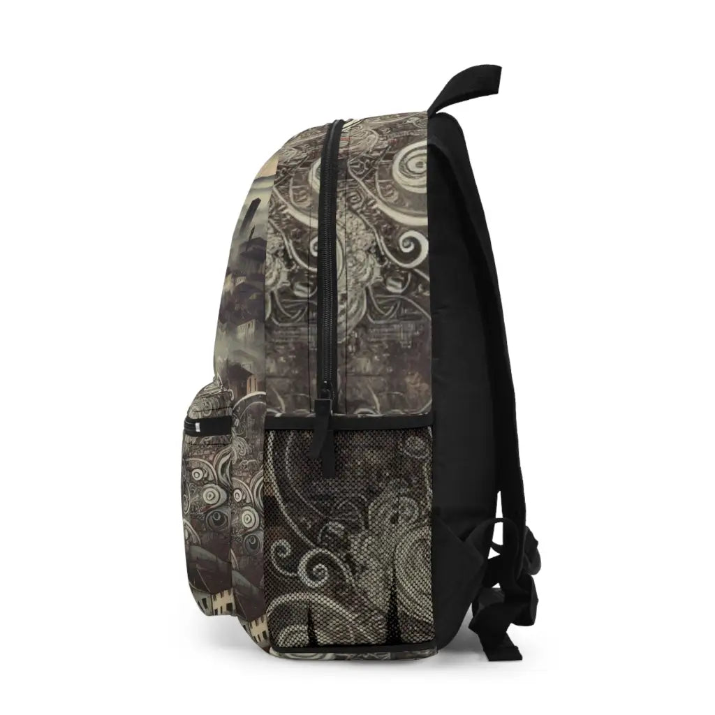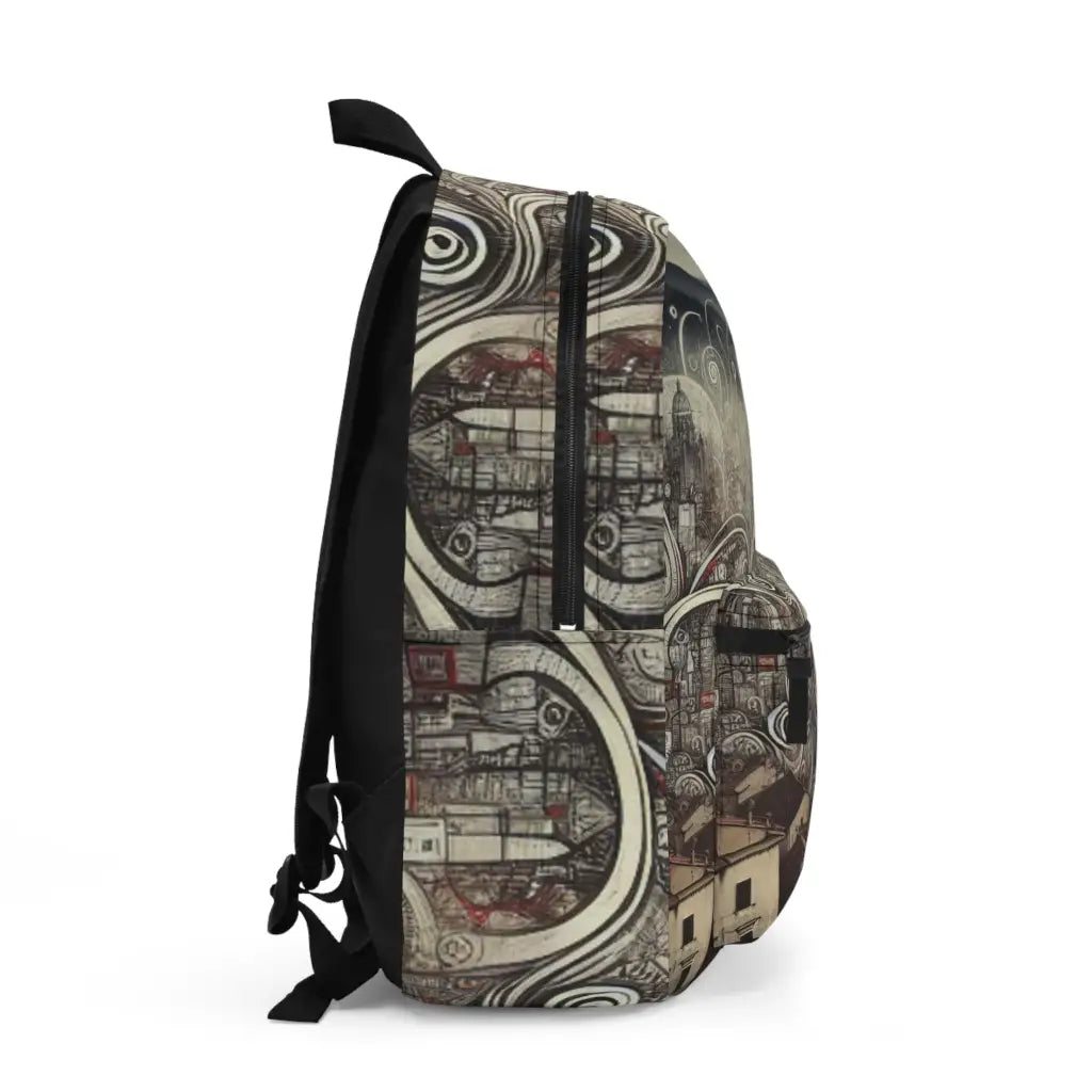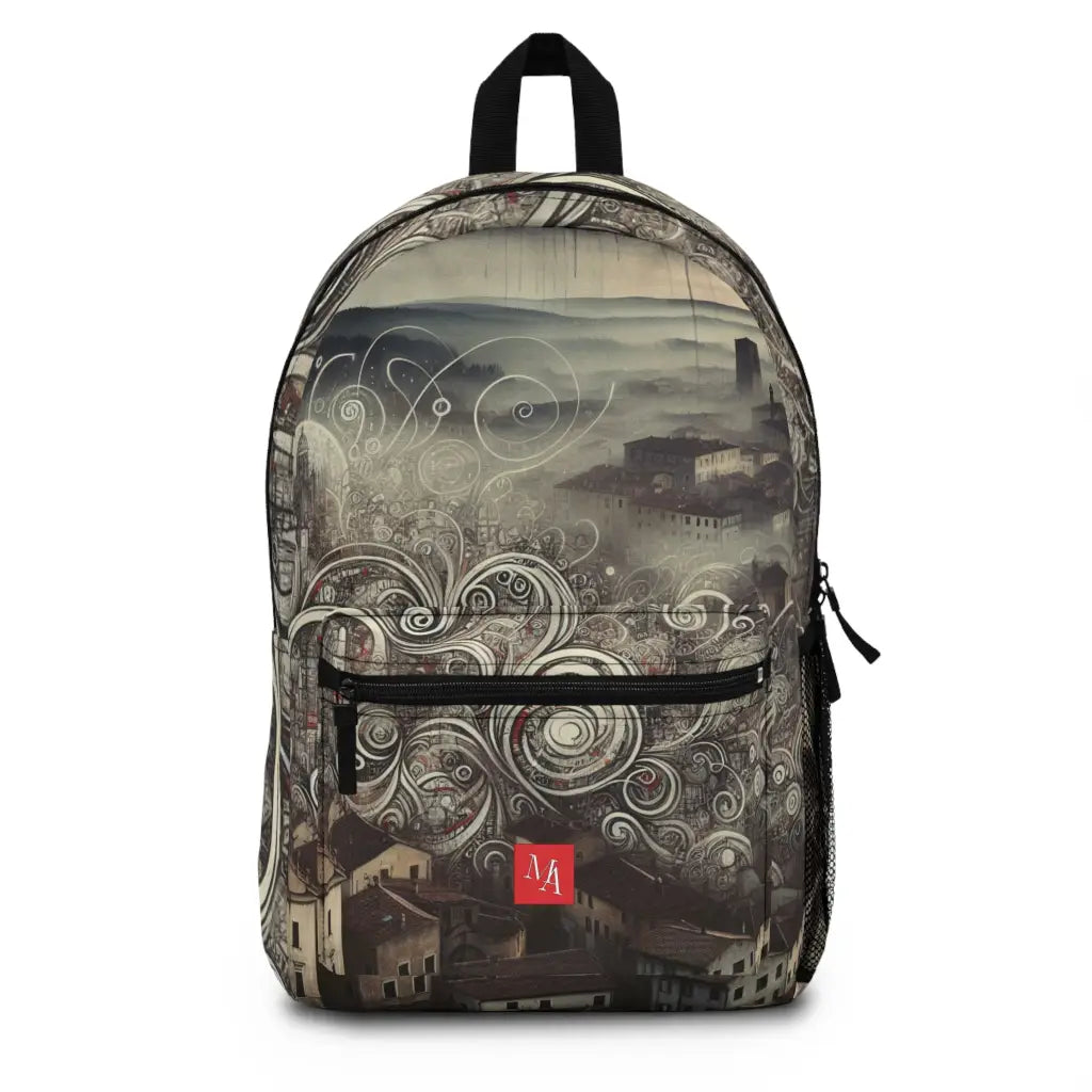 A dynamic interplay of intricate, flowing white and red graffiti lines adorns a reflective surface. The abstract swirls create a striking contrast against the subdued urban backdrop, blending art with the cityscape, offering a sense of creative spontaneity and urban vibrancy. Introducing the ultimate backpack for fashion-forward adventurers! Our backpack boasts a striking textile design that will make a statement wherever you go. With its durable construction and spacious compartments, it is perfect for carrying all your essentials. Get ready to turn heads and stay organized with our backpack. #textiledesign #backpack #fashionforward #adventure #durable #spacious #statementpiece #organized #essentials #travel #explore
