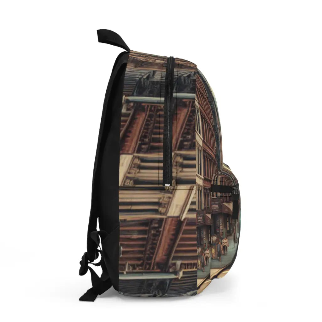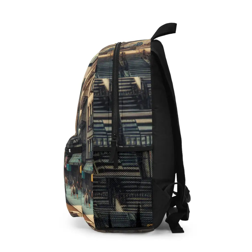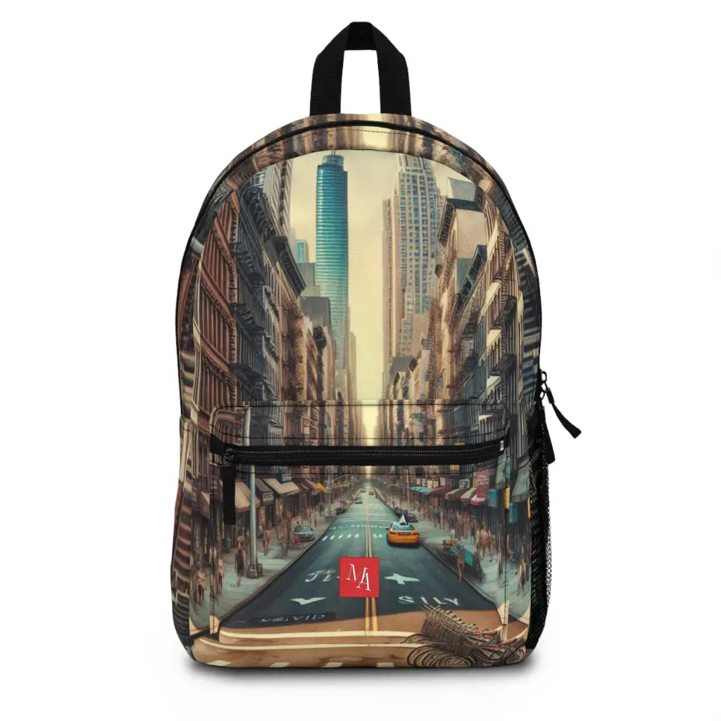 A fisheye lens captures a bustling urban street, emphasizing towering skyscrapers and vibrant city life. The curved perspective distorts and dramatizes the scene, enhancing the architectural dynamics and everyday activity, while a yellow taxi and bicycles add quintessential urban charm. Introducing the ultimate backpack for fashion-forward adventurers! Our backpack boasts a striking textile design that will make a statement wherever you go. With its durable construction and spacious compartments, it is perfect for carrying all your essentials. Get ready to turn heads and stay organized with our backpack. #textiledesign #backpack #fashionforward #adventure #durable #spacious #statementpiece #organized #essentials #travel #explore