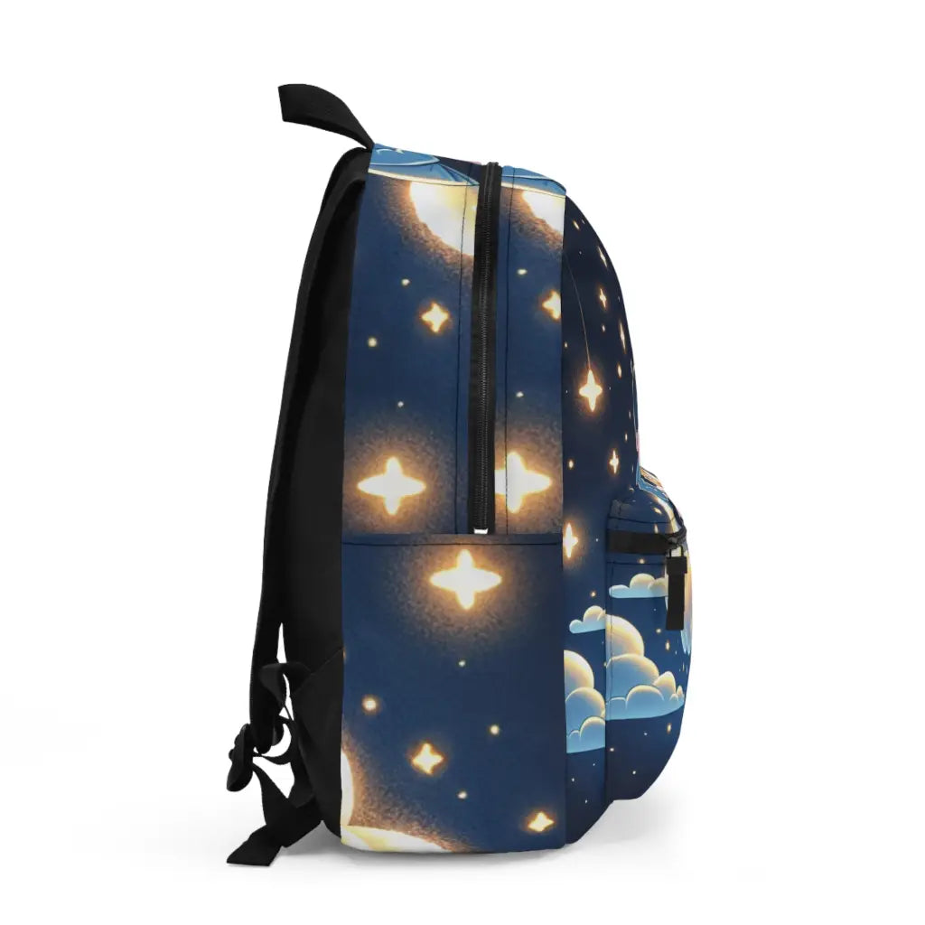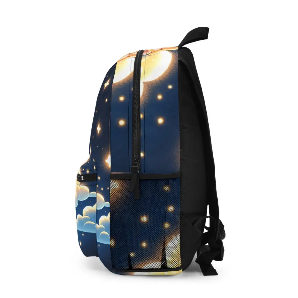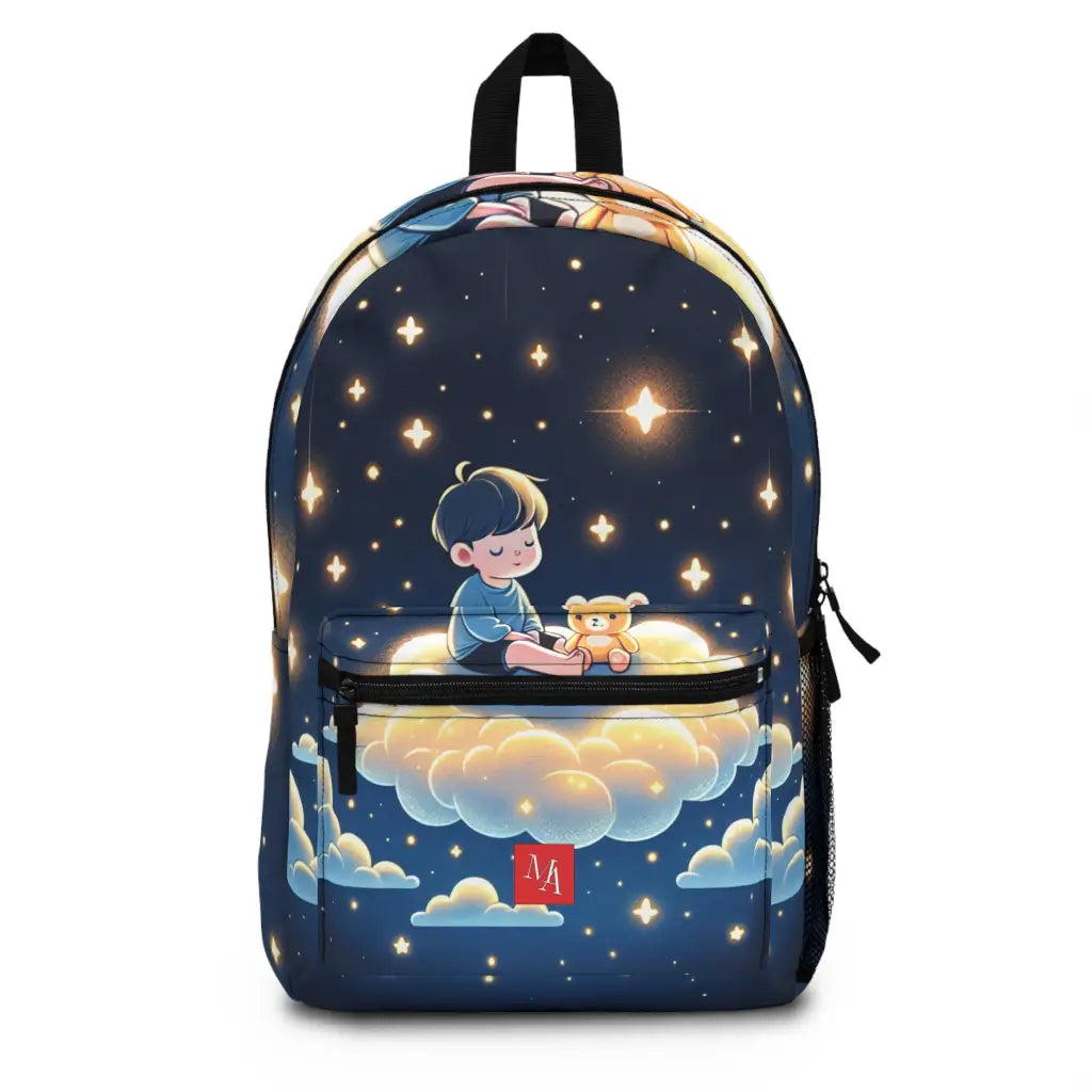 A dreamy scene with a girl and a duck sitting on a star-speckled cloud, floating through a serene, starry night sky. The mix of soft colors and whimsical elements adds a sense of wonder and tranquility. Introducing the ultimate backpack for fashion-forward adventurers! Our backpack boasts a striking textile design that will make a statement wherever you go. With its durable construction and spacious compartments, it is perfect for carrying all your essentials. Get ready to turn heads and stay organized with our backpack. #textiledesign #backpack #fashionforward #adventure #durable #spacious #statementpiece #organized #essentials #travel #explore
