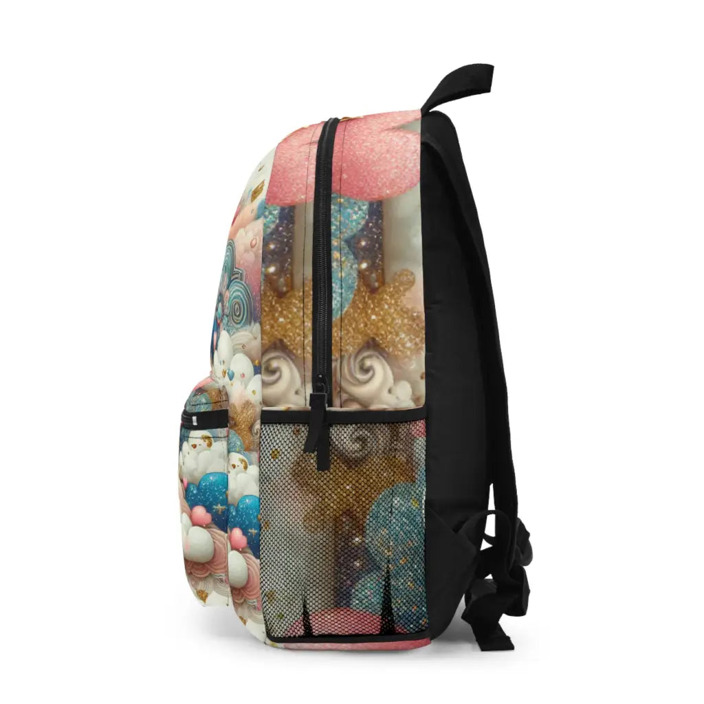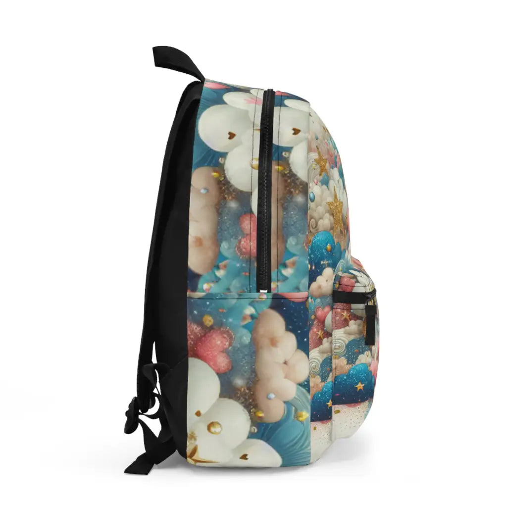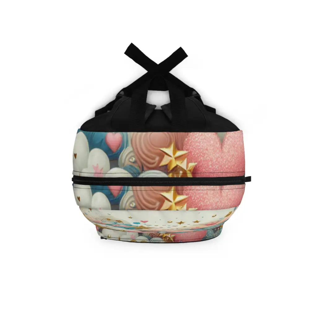 Whimsical illustration featuring dreamy pastel clouds adorned with gold sparkles, surrounded by playful pink and blue hearts, and glittering gold stars. A magical scene blending celestial elements with heartwarming affection. Introducing the ultimate backpack for fashion-forward adventurers! Our backpack boasts a striking textile design that will make a statement wherever you go. With its durable construction and spacious compartments, it is perfect for carrying all your essentials. Get ready to turn heads and stay organized with our backpack. #textiledesign #backpack #fashionforward #adventure #durable #spacious #statementpiece #organized #essentials #travel #explore