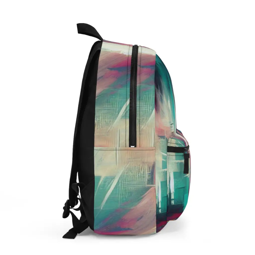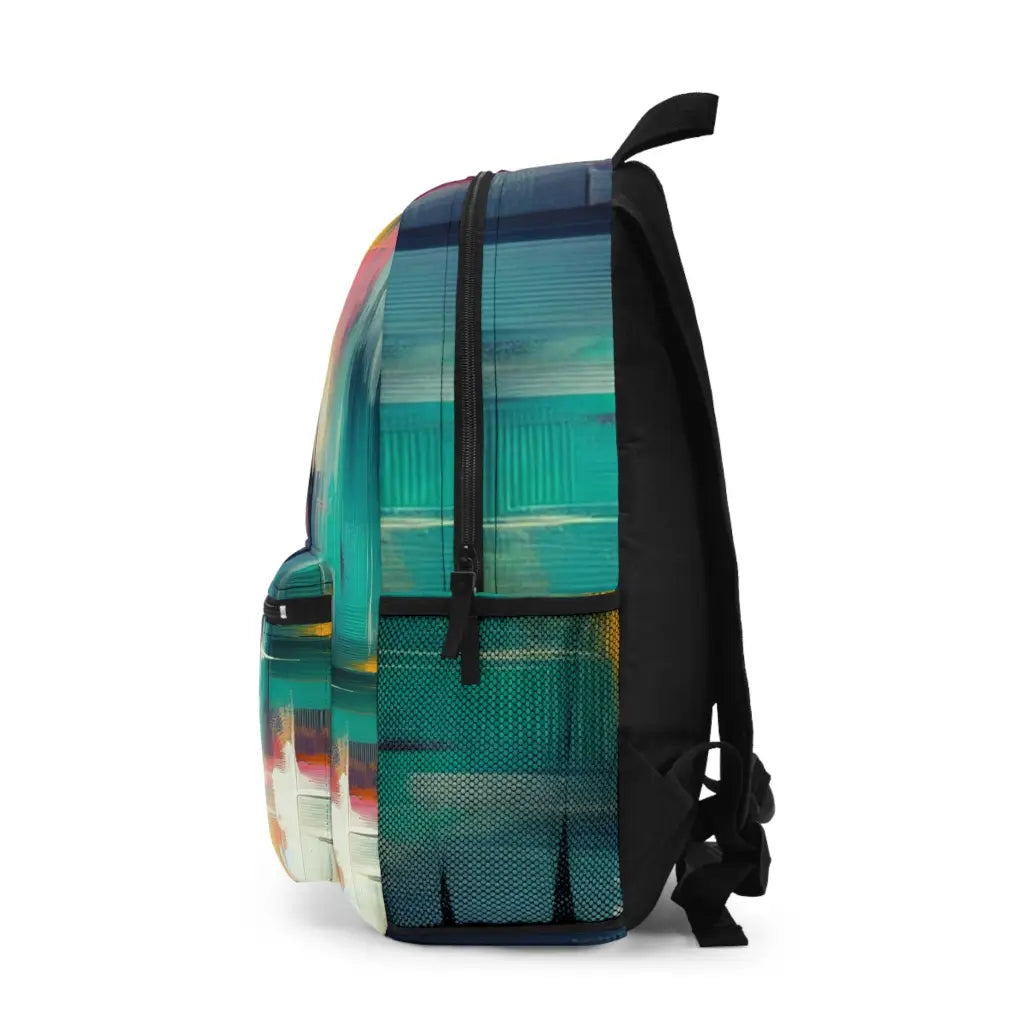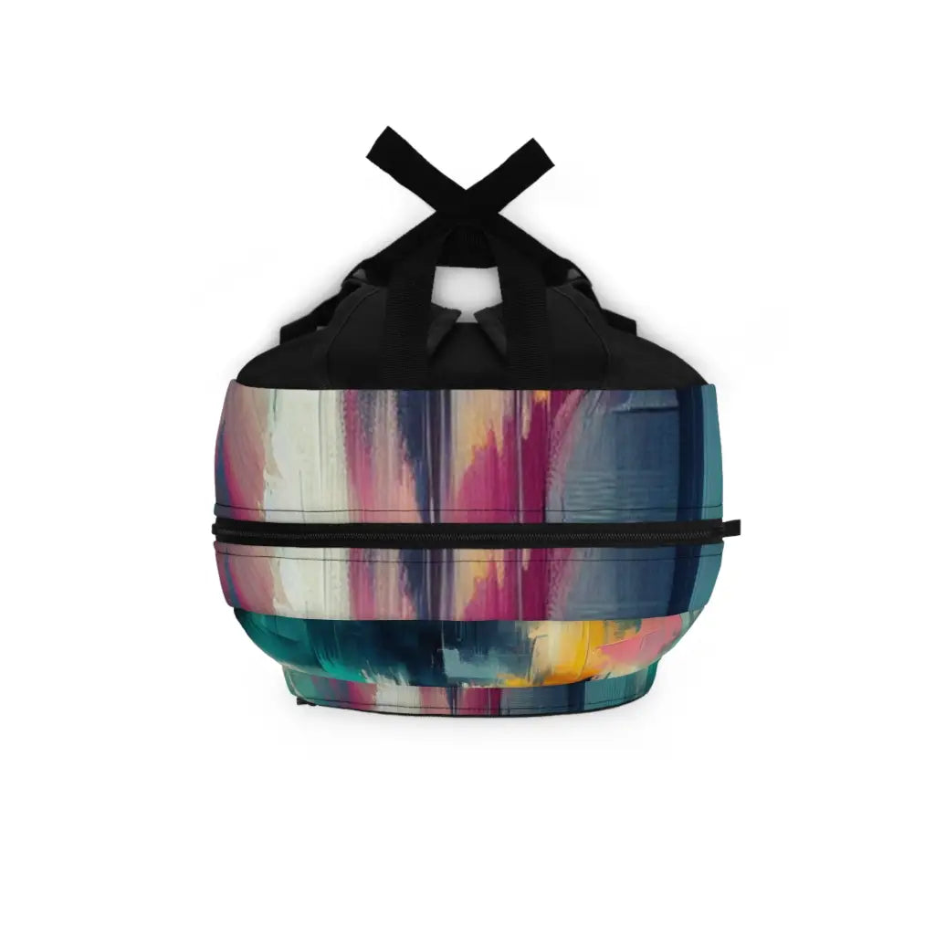 An abstract symphony of vivid colors and dynamic textures, this image blends turquoise, magenta, and mustard hues in a cascade of bold strokes and angular forms, creating an energizing, dreamlike cityscape that dances with light and movement. Introducing the ultimate backpack for fashion-forward adventurers! Our backpack boasts a striking textile design that will make a statement wherever you go. With its durable construction and spacious compartments, it is perfect for carrying all your essentials. Get ready to turn heads and stay organized with our backpack. #textiledesign #backpack #fashionforward #adventure #durable #spacious #statementpiece #organized #essentials #travel #explore