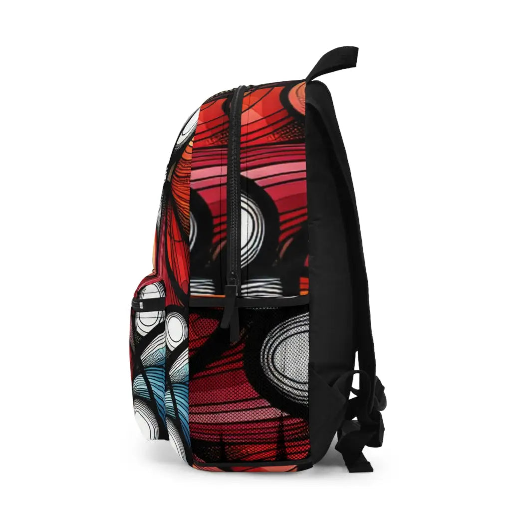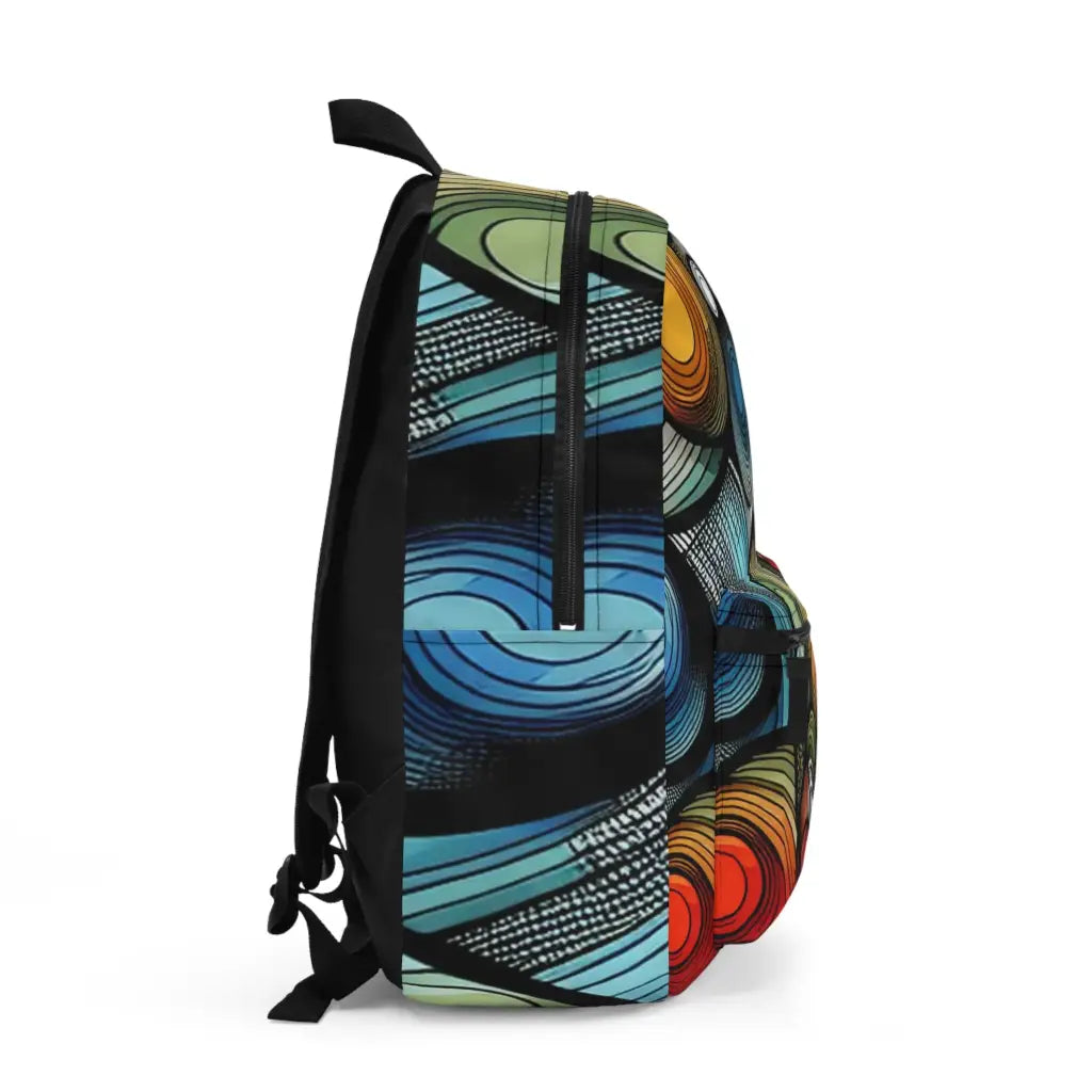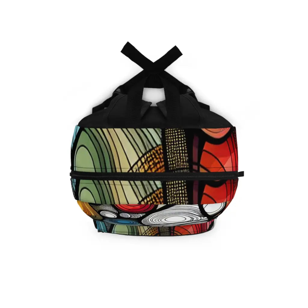A vibrant tapestry of swirling circles and arcs, this abstract piece blends dynamic colors and intricate patterns, creating a sense of motion and depth. The artwork's playful geometry and rich textures evoke a whimsical, dreamlike atmosphere. Introducing the ultimate backpack for fashion-forward adventurers! Our backpack boasts a striking textile design that will make a statement wherever you go. With its durable construction and spacious compartments, it is perfect for carrying all your essentials. Get ready to turn heads and stay organized with our backpack. #textiledesign #backpack #fashionforward #adventure #durable #spacious #statementpiece #organized #essentials #travel #explore