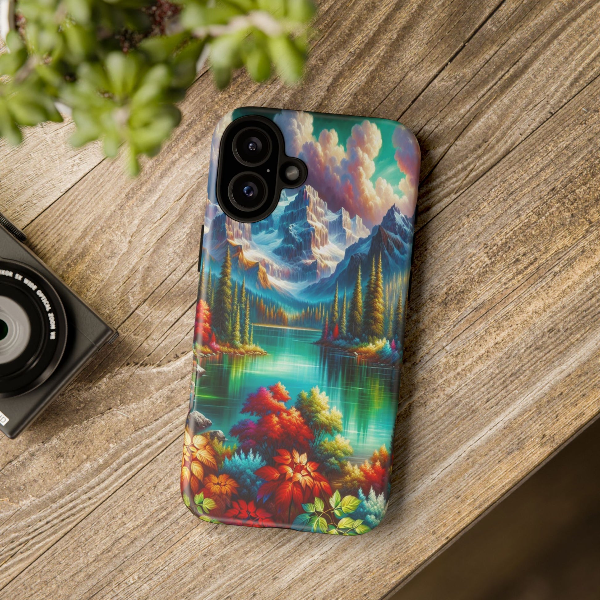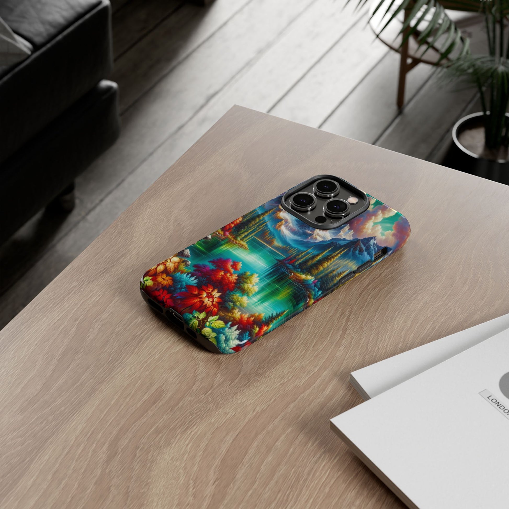 A vibrant fantasy landscape bursts with color, featuring snow-capped mountains under dramatic skies, mirrored in a tranquil lake surrounded by vivid, multicolored foliage that creates a dreamlike, serene atmosphere. iPhone, Samsung Galaxy, and Google Pixel devices with premium-quality custom protective phone cases. Every case has double layers for extra durability and protection while the clear, open ports stay out of your way when it comes to charging. The outer polycarbonate shell will resist daily impacts. Choose between matte or glossy finish and enjoy adding a unique touch to your phone with our custom protective phone cases sourced from Korea.