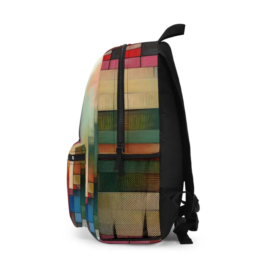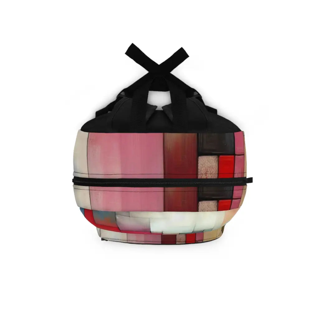 Vibrant geometric abstraction with interlocking rectangles in warm tones. The composition blends dynamic depth and subtle textures, creating an engaging interplay of colors and light, evoking a sense of movement and depth in a harmonious visual symphony. Introducing the ultimate backpack for fashion-forward adventurers! Our backpack boasts a striking textile design that will make a statement wherever you go. With its durable construction and spacious compartments, it is perfect for carrying all your essentials. Get ready to turn heads and stay organized with our backpack. #textiledesign #backpack #fashionforward #adventure #durable #spacious #statementpiece #organized #essentials #travel #explore