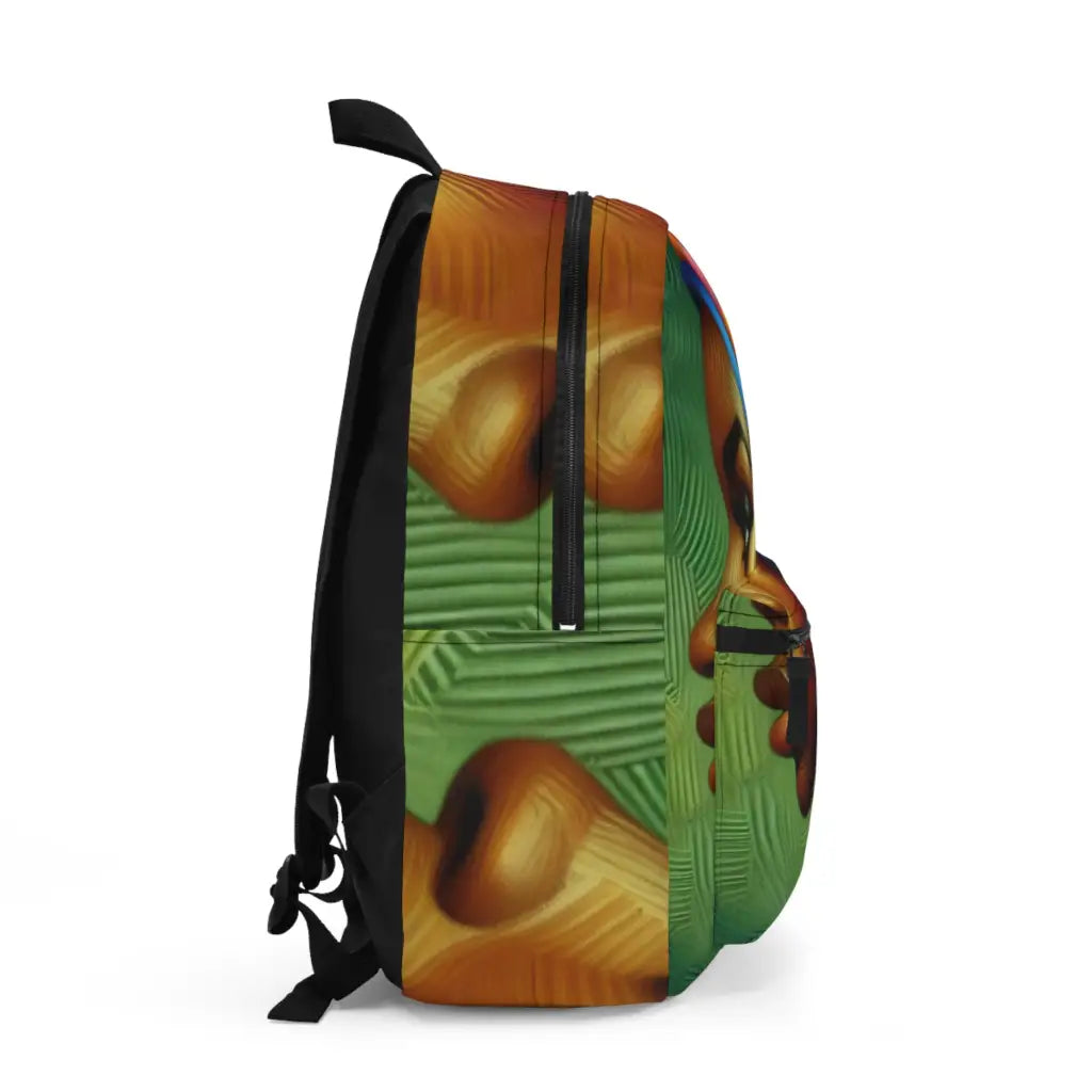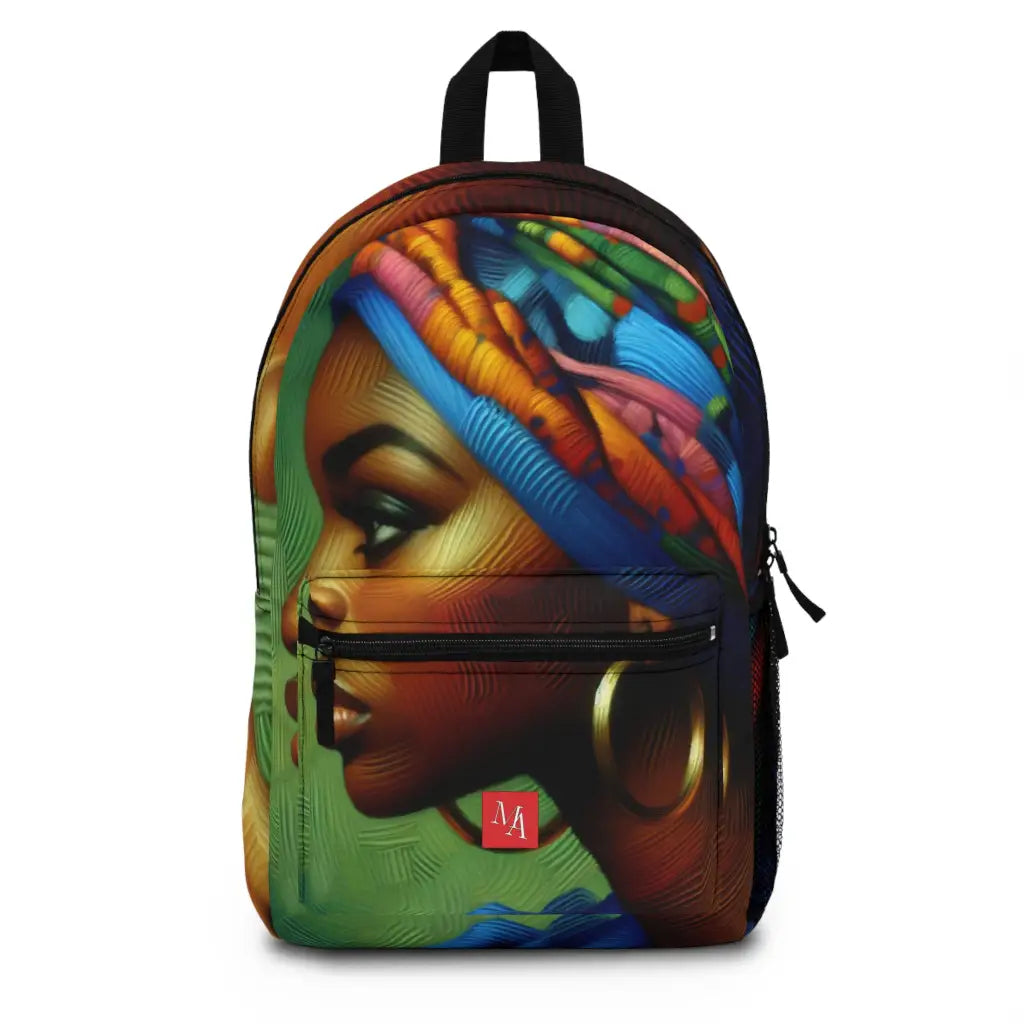 Bold, vivid colors swirl energetically in a modern portrait, highlighting a woman's elegantly styled hair and hoop earrings. The interplay of light and shadow captures depth, set against a rich green background, evoking a sense of strength and creative expression. Introducing the ultimate backpack for fashion-forward adventurers! Our backpack boasts a striking textile design that will make a statement wherever you go. With its durable construction and spacious compartments, it is perfect for carrying all your essentials. Get ready to turn heads and stay organized with our backpack. #textiledesign #backpack #fashionforward #adventure #durable #spacious #statementpiece #organized #essentials #travel #explore