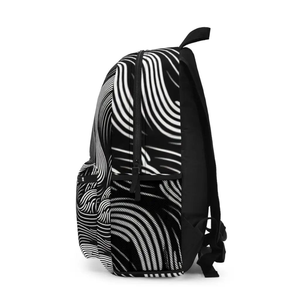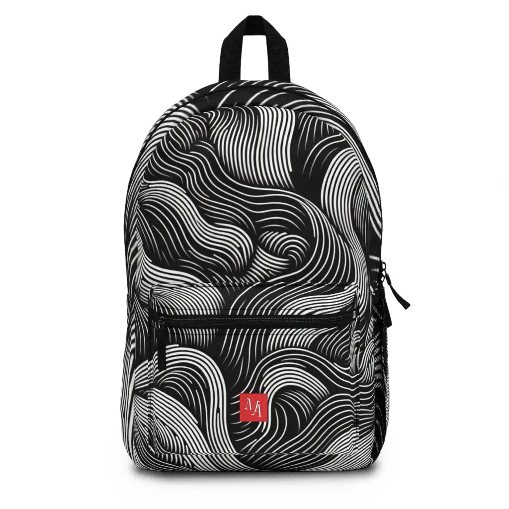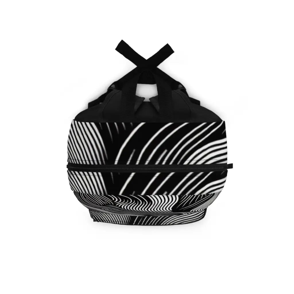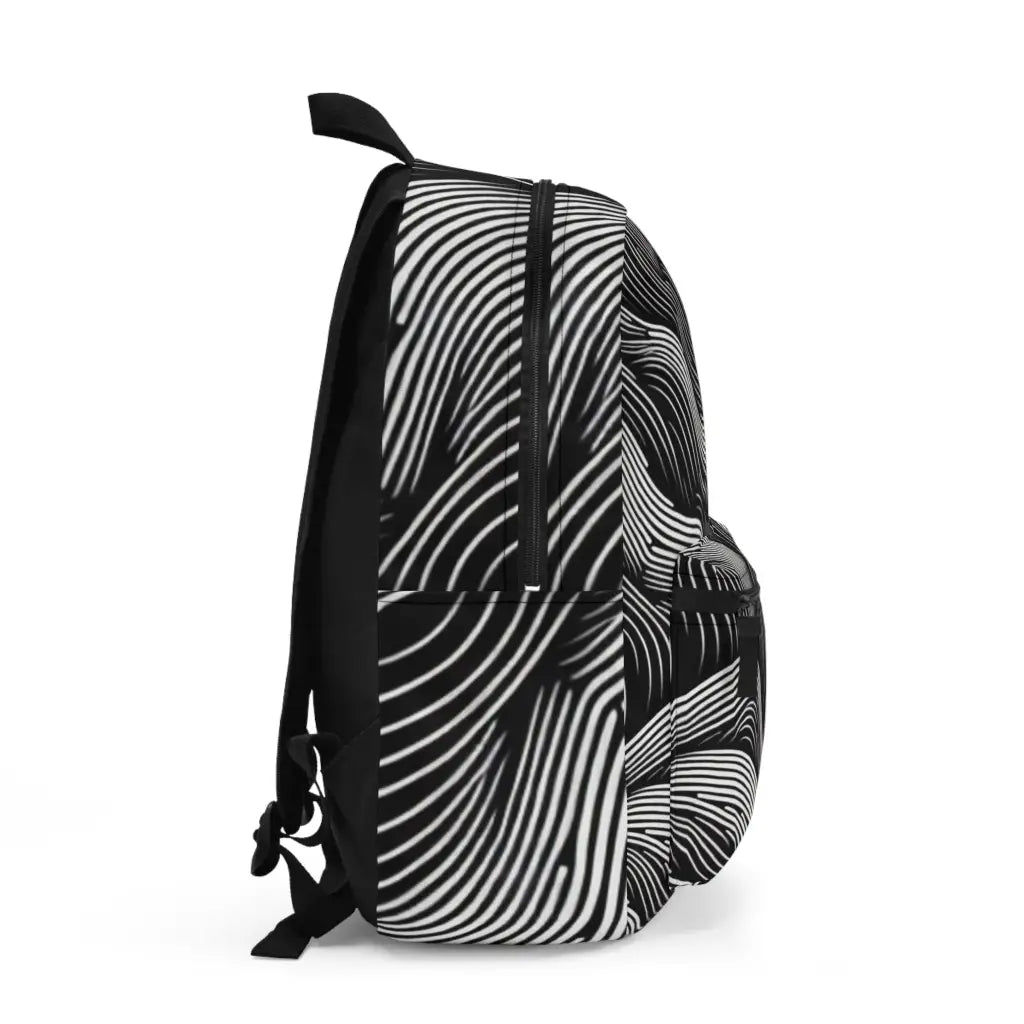 Snaking white lines meander playfully across a black backdrop, creating a dynamic, minimalist wave pattern. The rhythmic curves evoke fluidity and motion, adding a touch of whimsy and modernity to the design. Introducing the ultimate backpack for fashion-forward adventurers! Our backpack boasts a striking textile design that will make a statement wherever you go. With its durable construction and spacious compartments, it is perfect for carrying all your essentials. Get ready to turn heads and stay organized with our backpack. #textiledesign #backpack #fashionforward #adventure #durable #spacious #statementpiece #organized #essentials #travel #explore