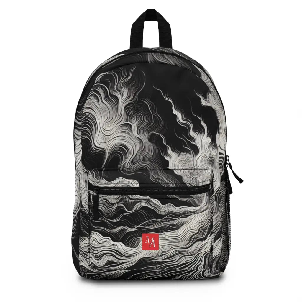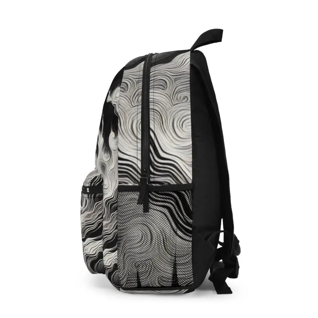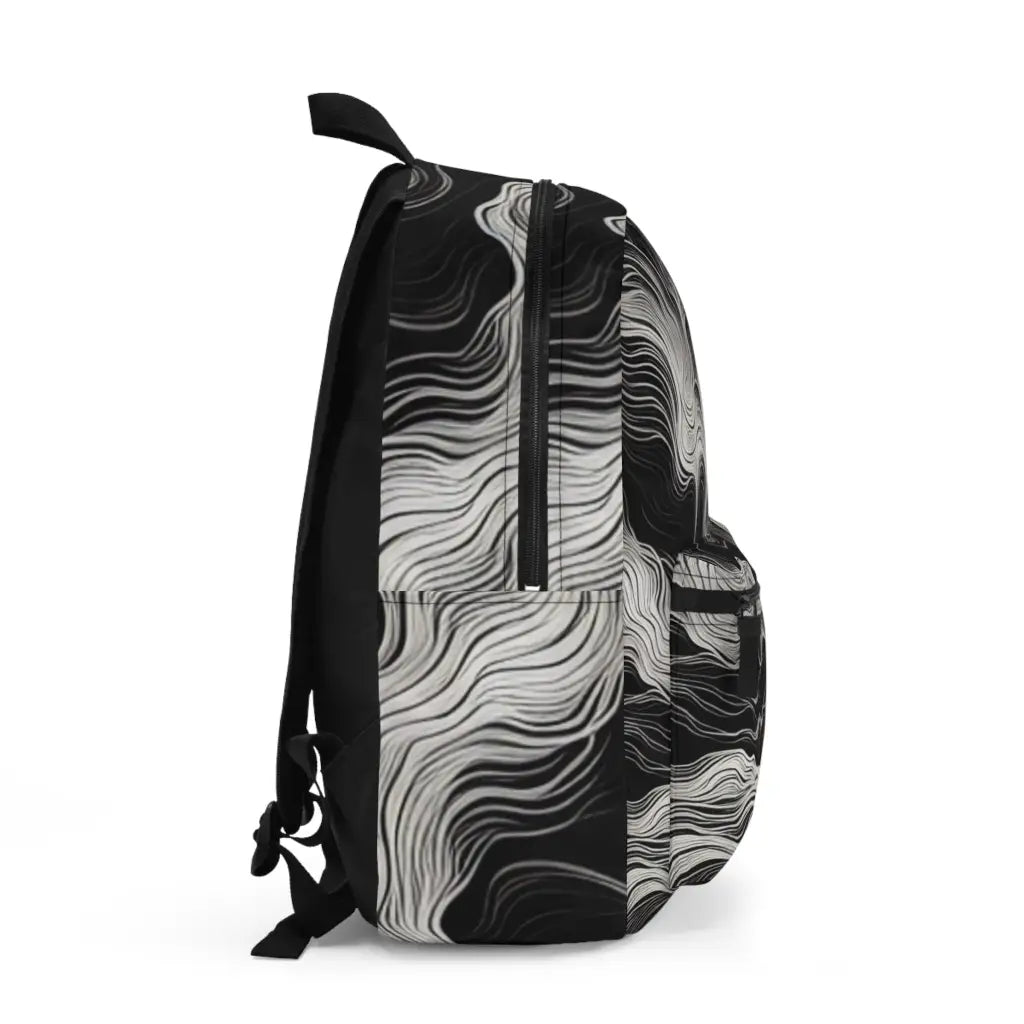 This image showcases a mesmerizing topographic design with fluid white lines elegantly swirling against a deep black background. The intricate contour patterns evoke a sense of dynamic movement, blending organic flow with geometric precision, creating a captivating visual rhythm. Introducing the ultimate backpack for fashion-forward adventurers! Our backpack boasts a striking textile design that will make a statement wherever you go. With its durable construction and spacious compartments, it is perfect for carrying all your essentials. Get ready to turn heads and stay organized with our backpack. #textiledesign #backpack #fashionforward #adventure #durable #spacious #statementpiece #organized #essentials #travel #explore