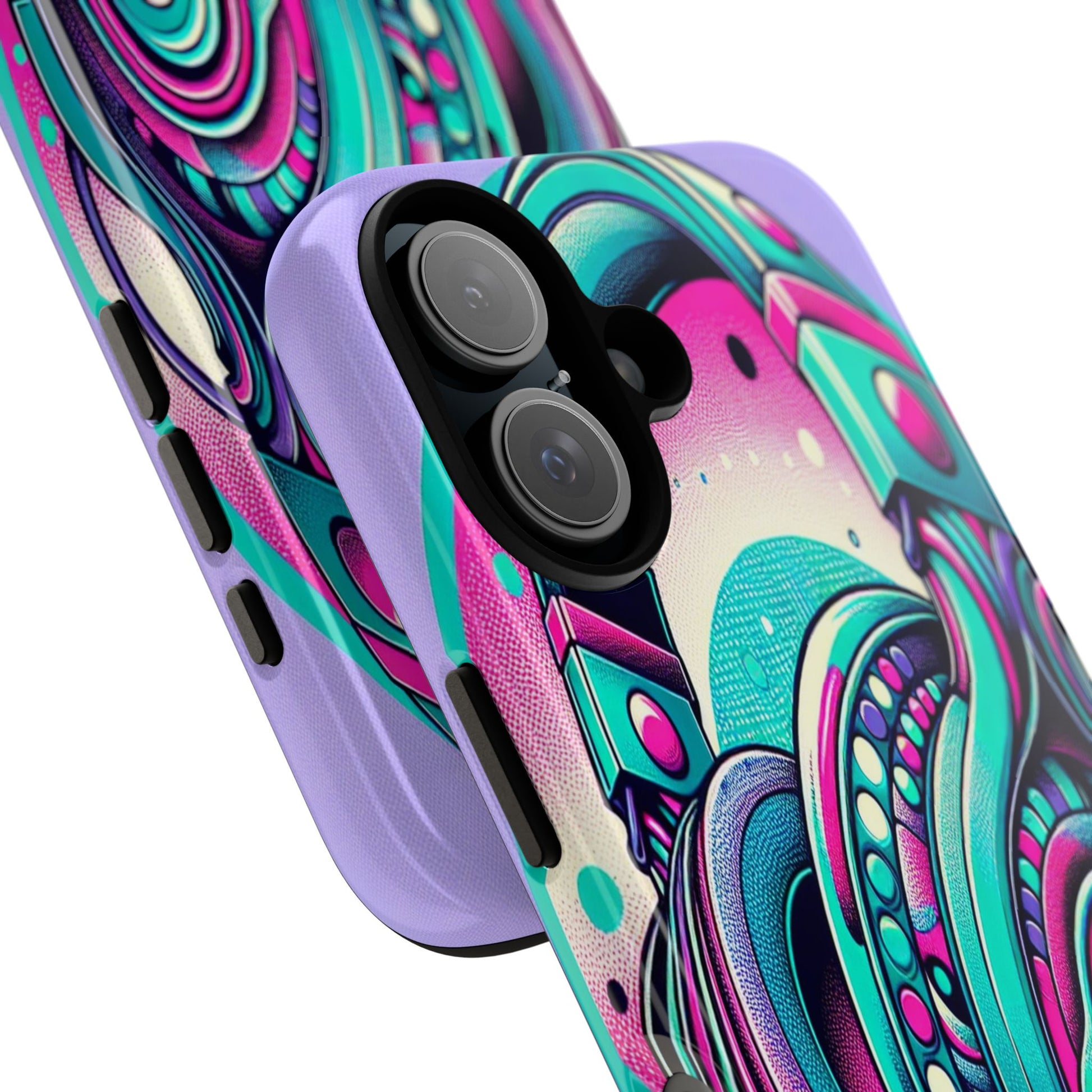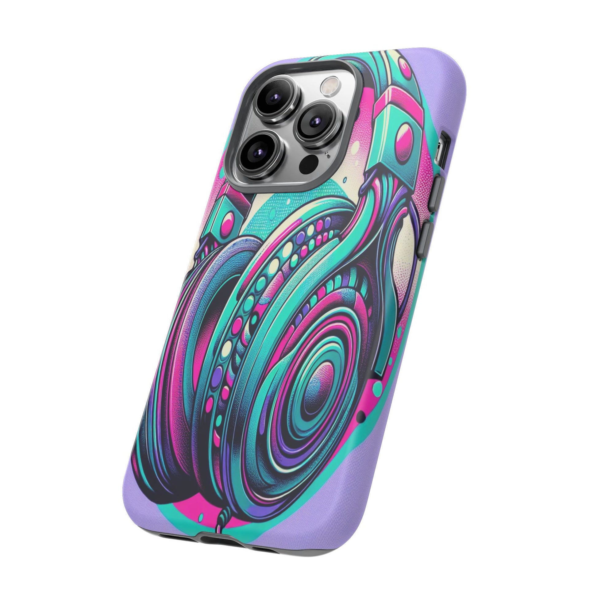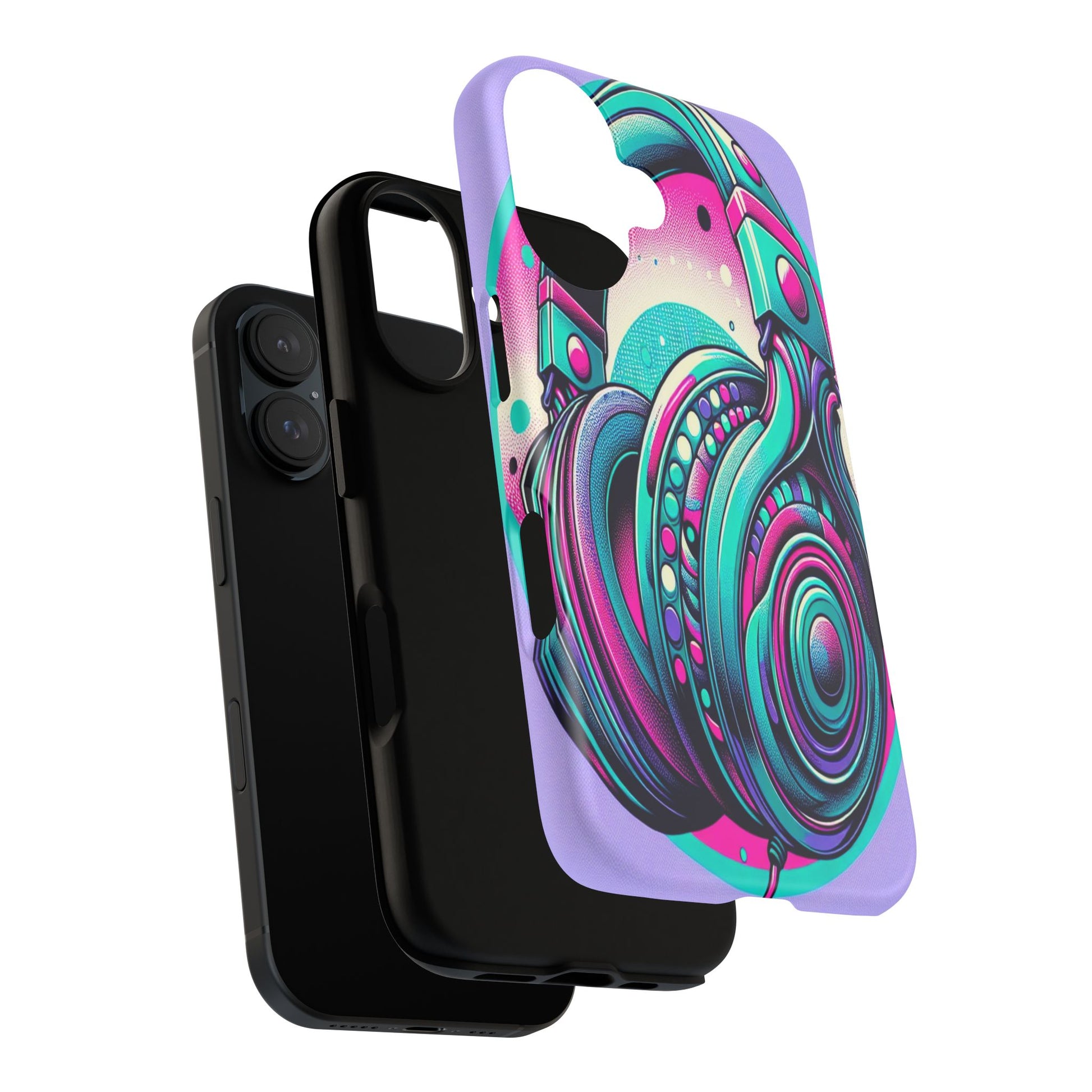 A vibrant neon illustration of futuristic headphones features bold turquoise, pink, and purple hues. The intricate digital patterns and dynamic circular background create a retro-futuristic vibe, blending vintage aesthetics with modern digital artistry. Protect your phone in style with our premium-quality custom protective phone cases, designed to fit iPhones from the latest iPhone 16 to older models like iPhone 7 and 8. Each case features double-layer protection with a durable polycarbonate outer shell and a soft TPU lining for extra impact resistance, making it ideal for daily use.