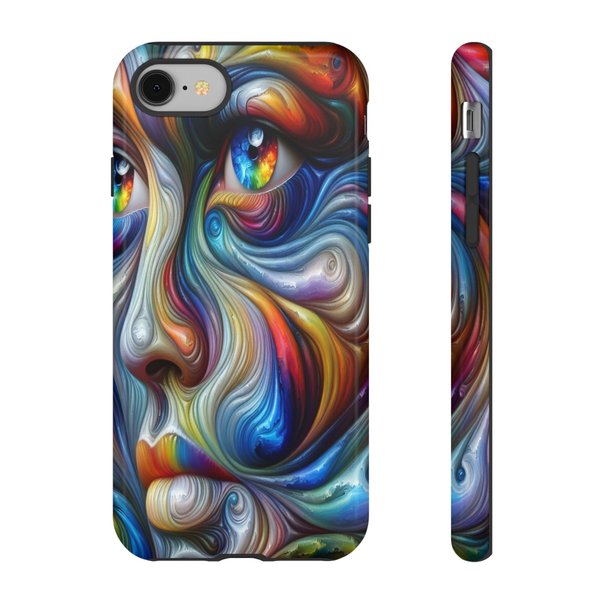 A mesmerizing swirl of vibrant colors forming a surreal face, where fluid lines create depth and dimension. The eyes are strikingly detailed, with galaxies swirling within, evoking a sense of cosmic wonder and endless imagination. Protect your phone in style with our premium-quality custom protective phone cases, designed to fit iPhones from the latest iPhone 16 to older models like iPhone 7 and 8. Each case features double-layer protection with a durable polycarbonate outer shell and a soft TPU lining for extra impact resistance, making it ideal for daily use.