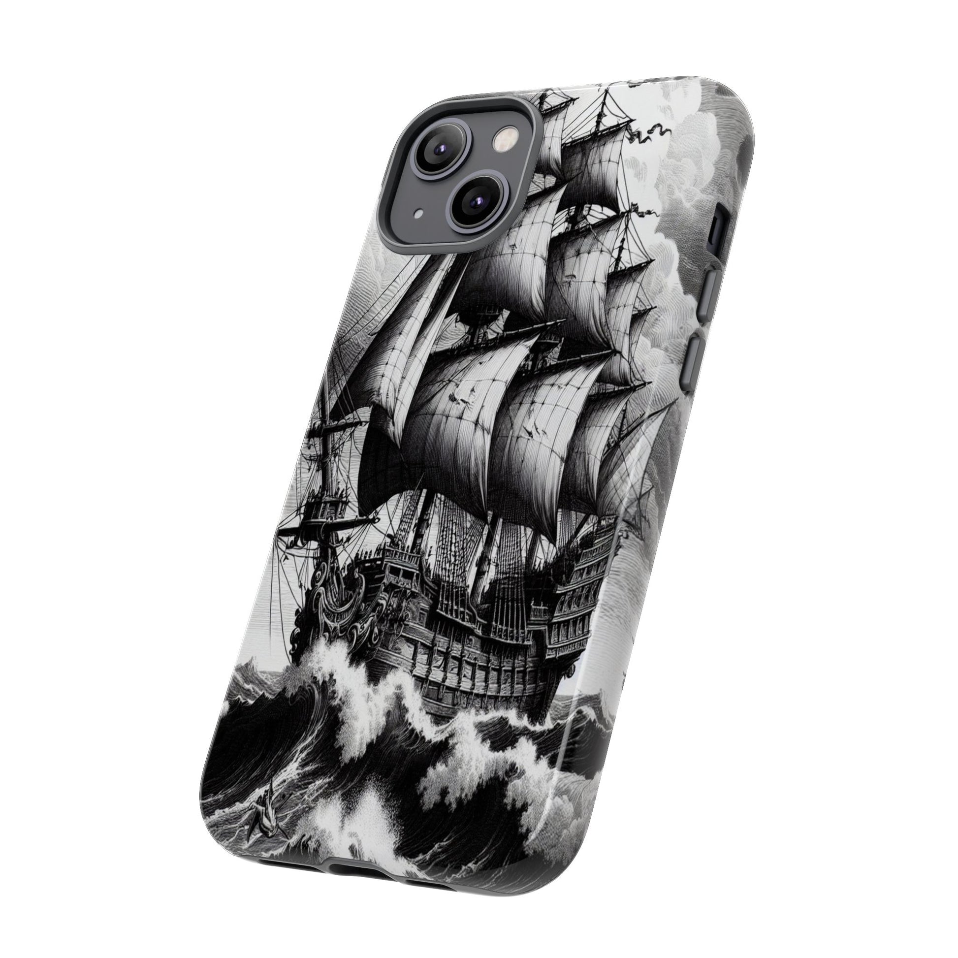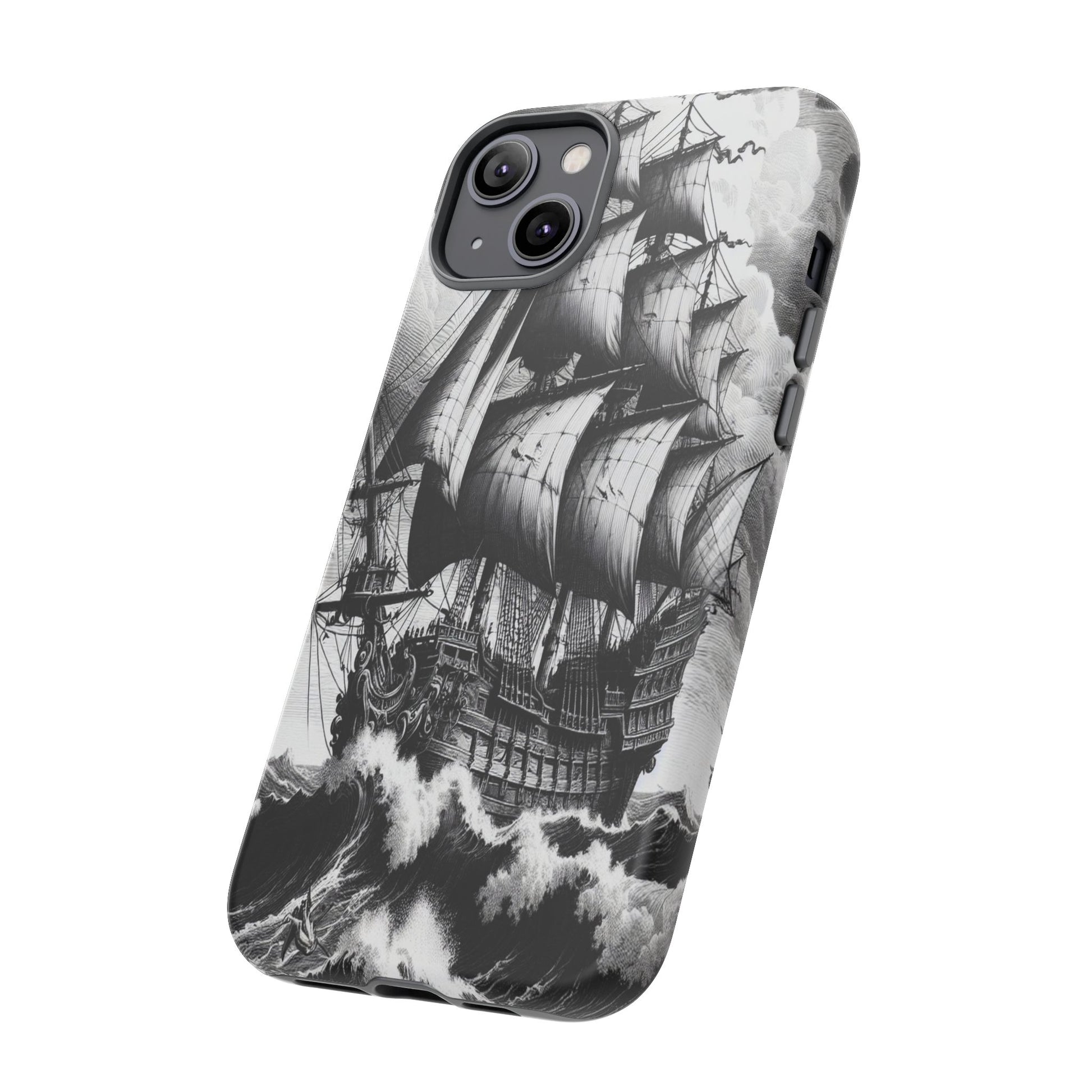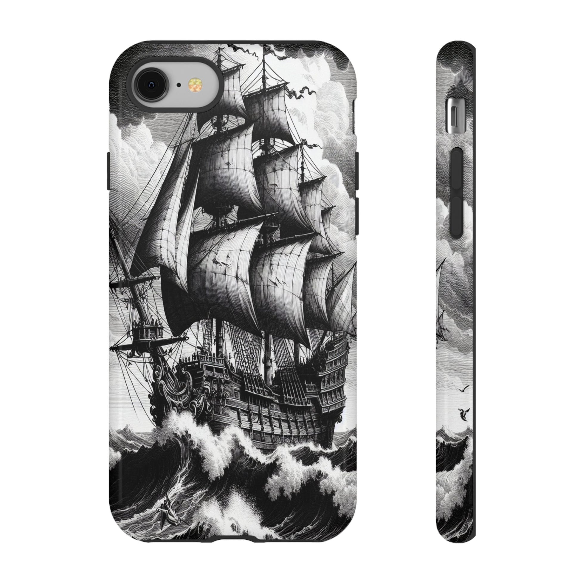 A majestic black-and-white engraving of a 17th-century galleon navigates turbulent seas, featuring swirling clouds and crashing waves. The intricate ship details and dynamic sea render motion and drama, capturing the essence of maritime adventure and nature’s power. Protect your phone in style with our premium-quality custom protective phone cases, designed to fit iPhones from the latest iPhone 16 to older models like iPhone 7 and 8. Each case features double-layer protection with a durable polycarbonate outer shell and a soft TPU lining for extra impact resistance, making it ideal for daily use.