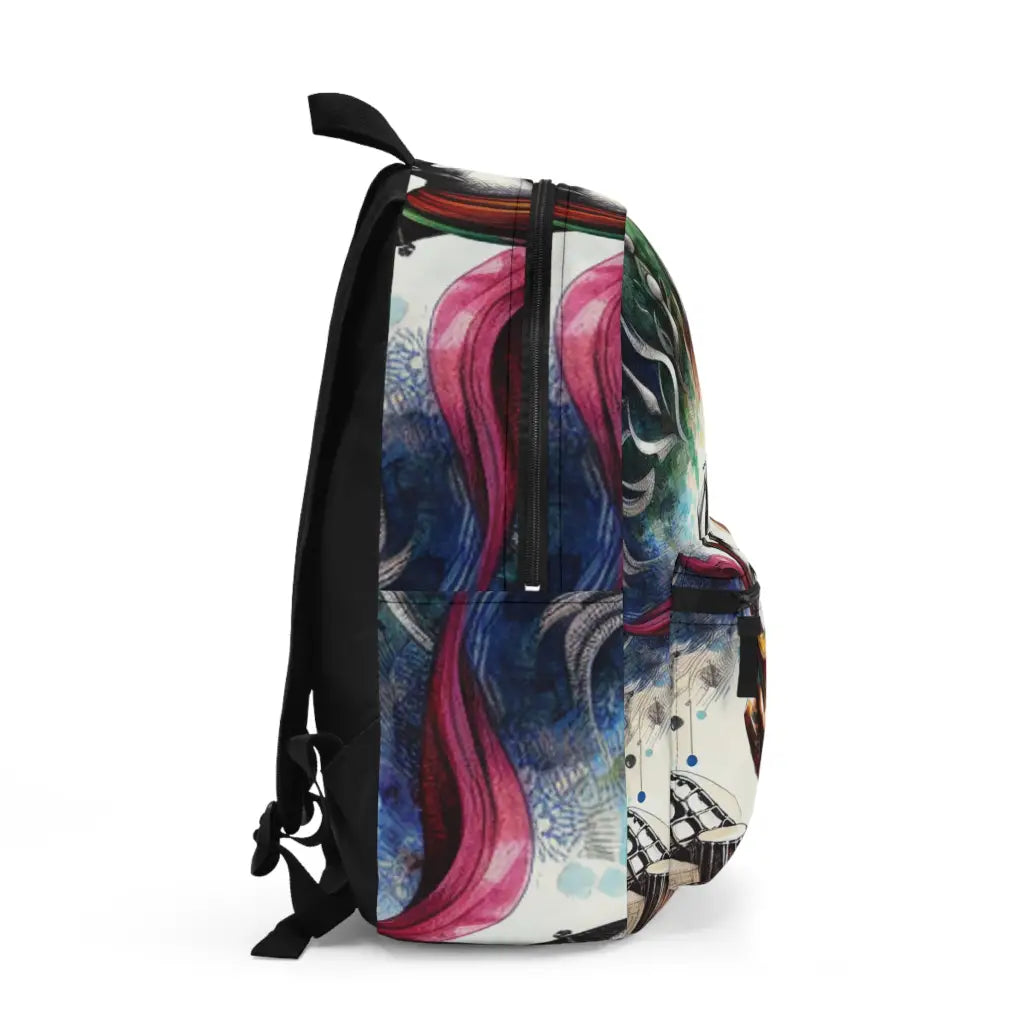 A vibrant celebration of culture and rhythm, featuring a dancer in colorful attire against a backdrop of musical notes and drums. Her silhouette entwines with a tree, symbolizing vitality and creativity in a vivid palette of swirling patterns and bold colors. Introducing the ultimate backpack for fashion-forward adventurers! Our backpack boasts a striking textile design that will make a statement wherever you go. With its durable construction and spacious compartments, it is perfect for carrying all your essentials. Get ready to turn heads and stay organized with our backpack. #textiledesign #backpack #fashionforward #adventure #durable #spacious #statementpiece #organized #essentials #travel #explore