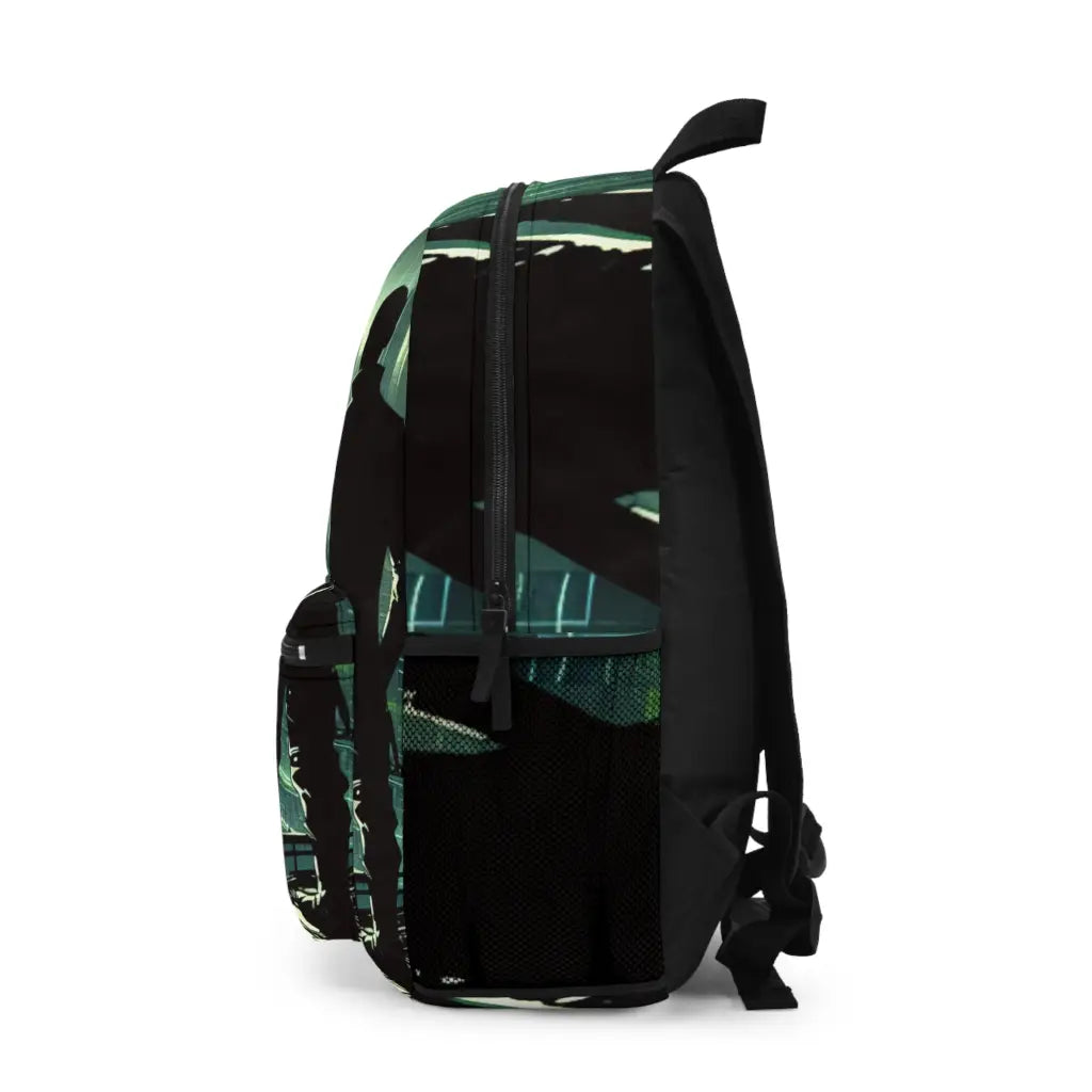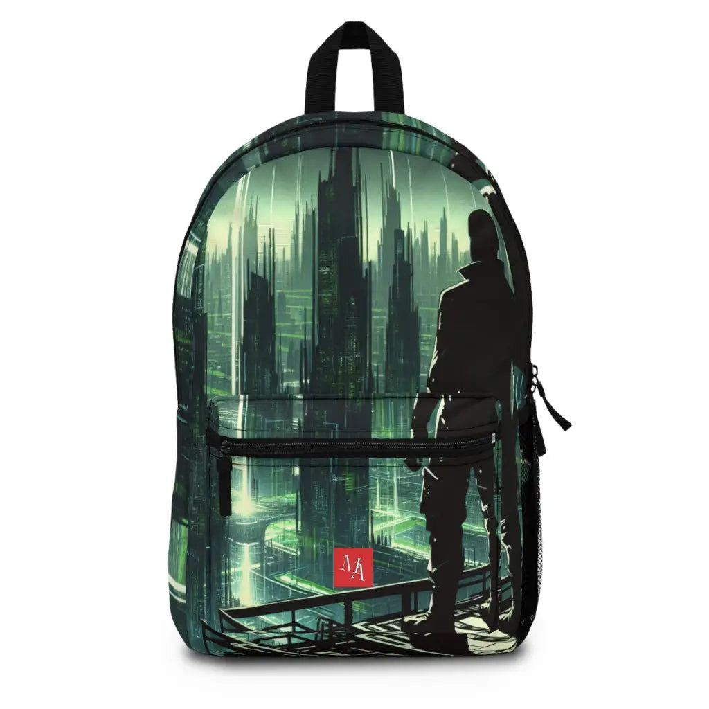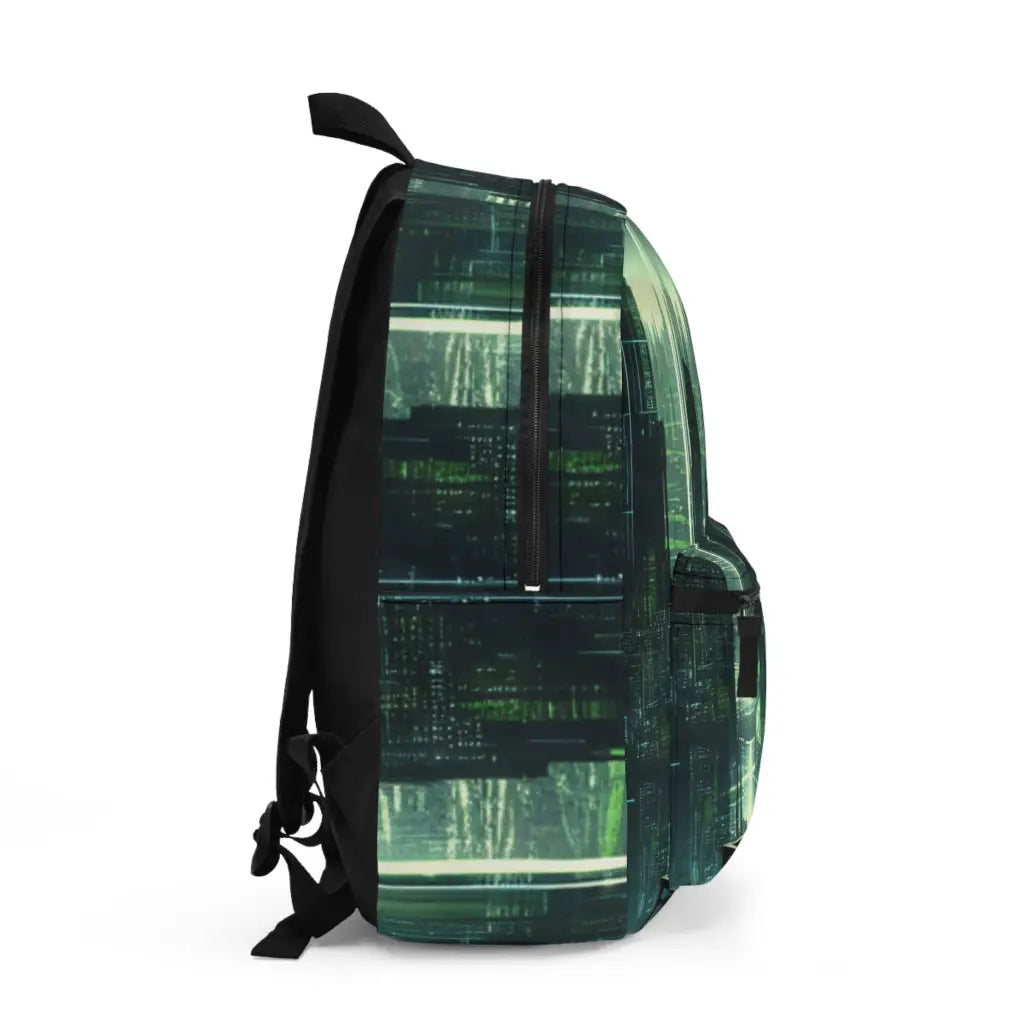 In this image, a solitary figure stands against a towering digital cityscape bathed in glowing green light. The futuristic setting, intricate circuitry, and neon vibes create a cyberpunk aesthetic, blending elements of technology and mystery. Introducing the ultimate backpack for fashion-forward adventurers! Our backpack boasts a striking textile design that will make a statement wherever you go. With its durable construction and spacious compartments, it is perfect for carrying all your essentials. Get ready to turn heads and stay organized with our backpack. #textiledesign #backpack #fashionforward #adventure #durable #spacious #statementpiece #organized #essentials #travel #explore