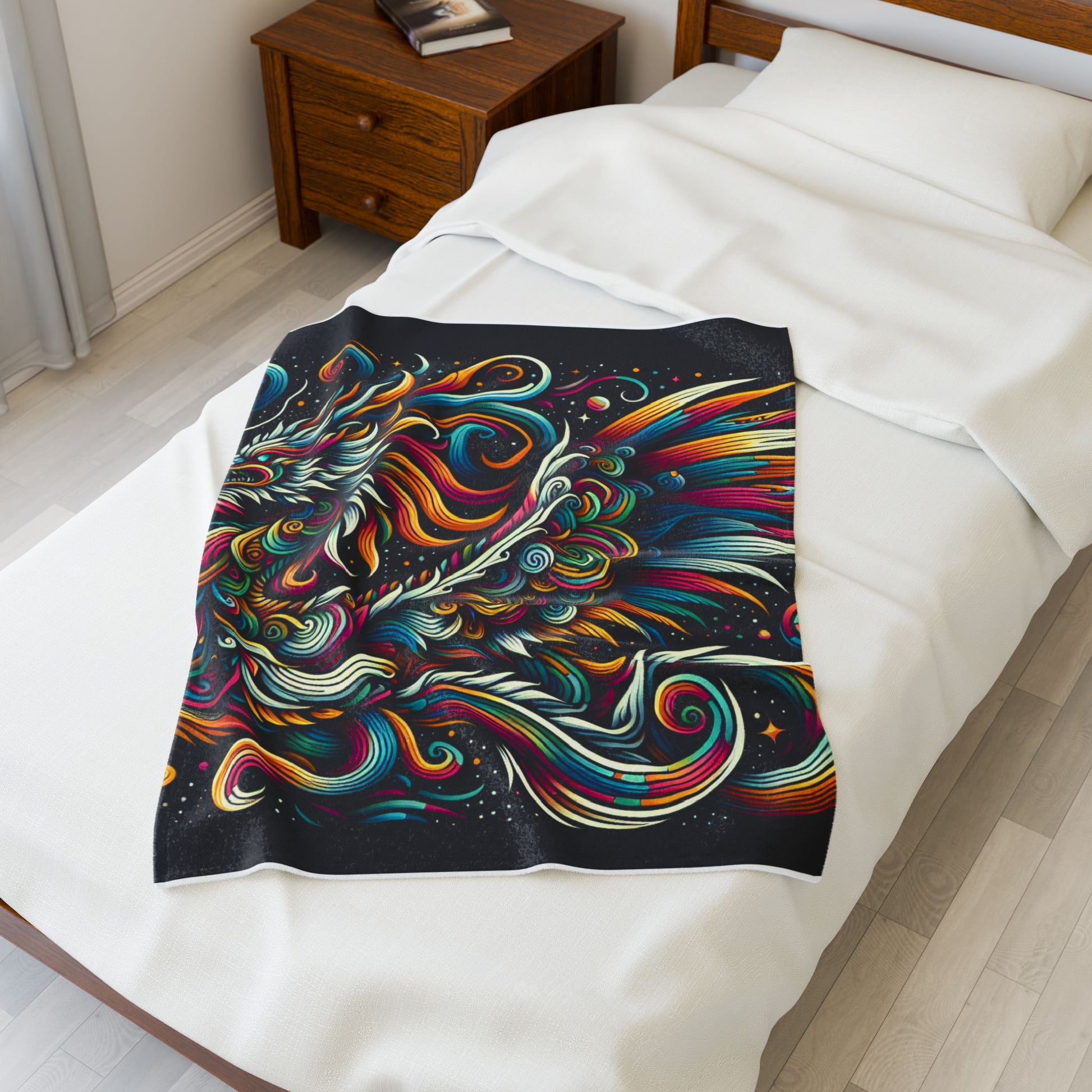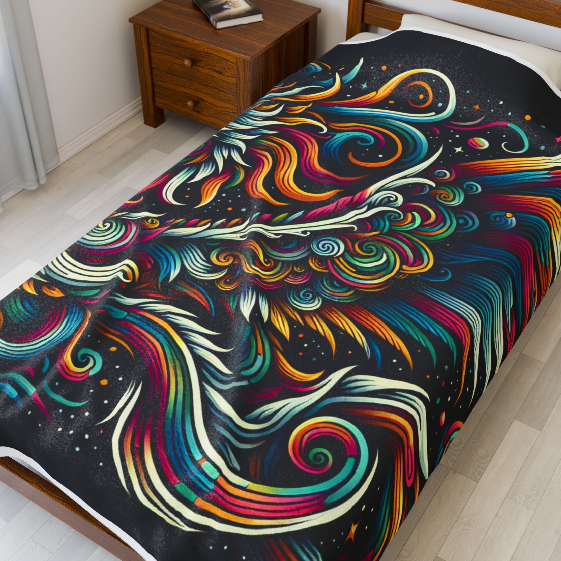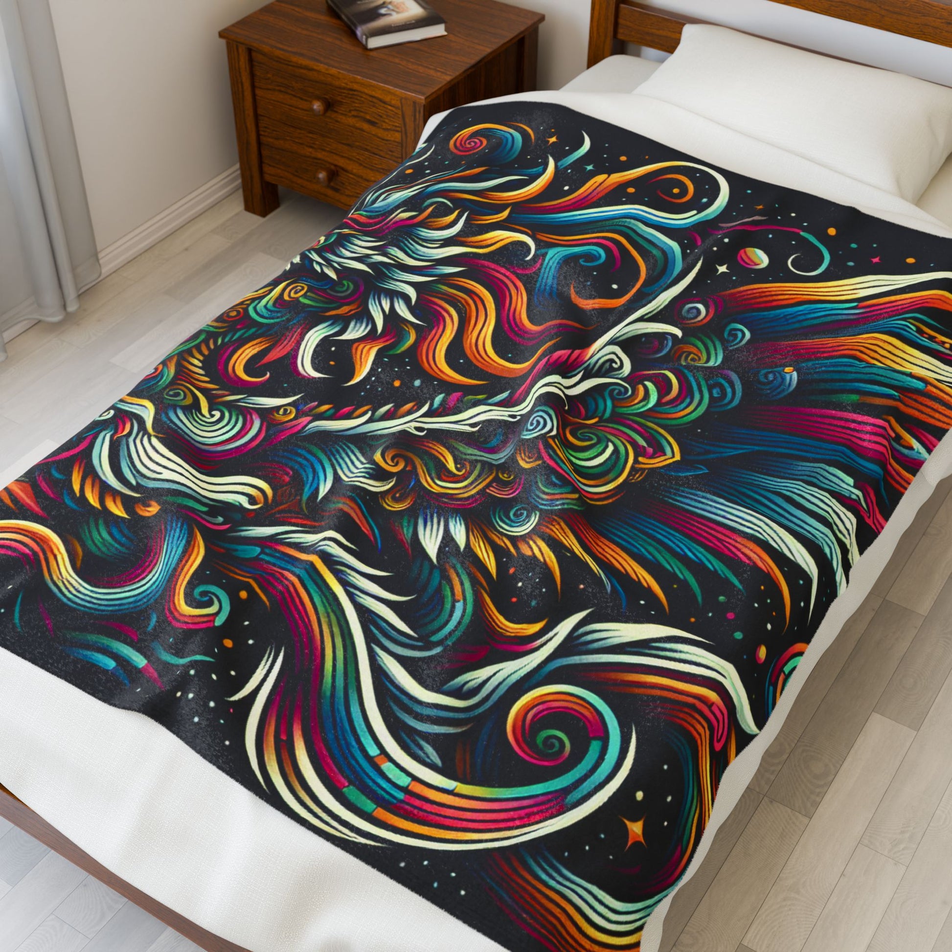 A vibrant, swirling dragon emerges in a kaleidoscope of colors, blending flowing lines and intricate patterns against a starry backdrop. Its dynamic form bursts with energy and motion, creating a mesmerizing fusion of mythical elegance and cosmic wonder. Create a cozy and warm atmosphere at home with this plush velveteen blanket. It is soft to touch and perfect for any home. Customize with a one-sided print to add your personal touch or create a gift for your friends and family. Available in three sizes: 30x40", 50x60", 60x80".