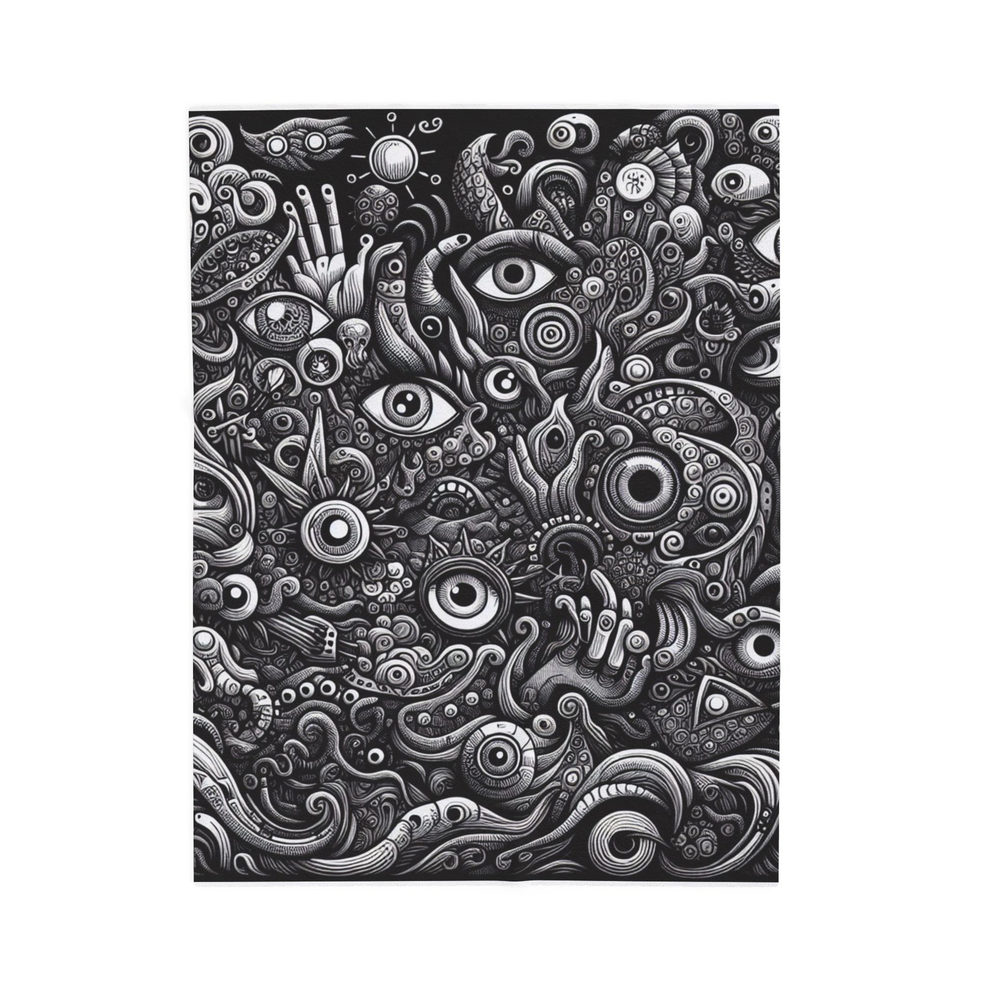 A monochrome tapestry of surreal, abstract motifs intertwines eyes and extraterrestrial forms, blending intricate patterns and swirling textures. This dreamlike composition captivates with its hypnotic symmetry and fantastical imagination. Create a cozy and warm atmosphere at home with this plush velveteen blanket. It is soft to touch and perfect for any home. Customize with a one-sided print to add your personal touch or create a gift for your friends and family. Available in three sizes: 30x40", 50x60", 60x80".