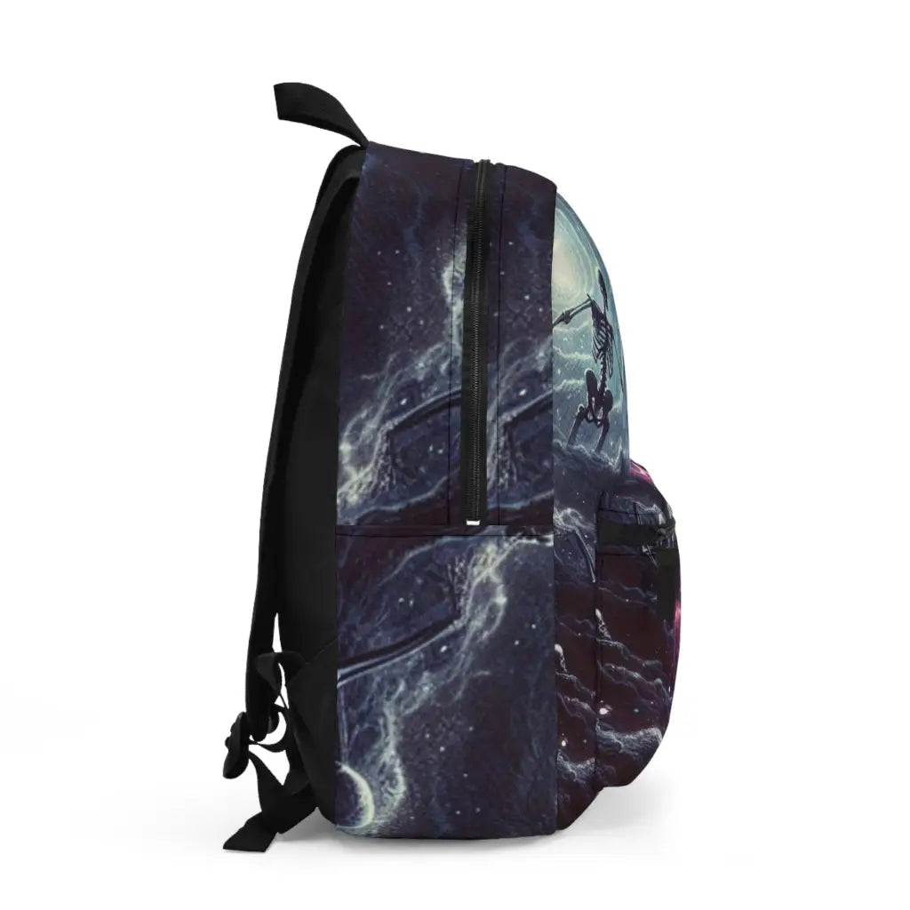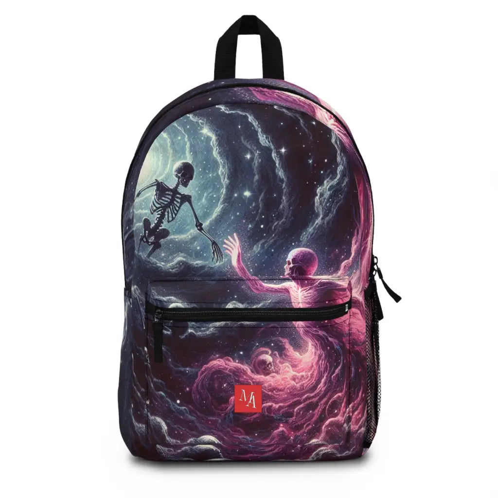 A cosmic dance of contrasts, where a vibrant figure and a skeleton reach across swirling galaxies, symbolizing life and death's eternal connection amidst the stars. Introducing the ultimate backpack for fashion-forward adventurers! Our backpack boasts a striking textile design that will make a statement wherever you go. With its durable construction and spacious compartments, it is perfect for carrying all your essentials. Get ready to turn heads and stay organized with our backpack. #textiledesign #backpack #fashionforward #adventure #durable #spacious #statementpiece #organized #essentials #travel #explore