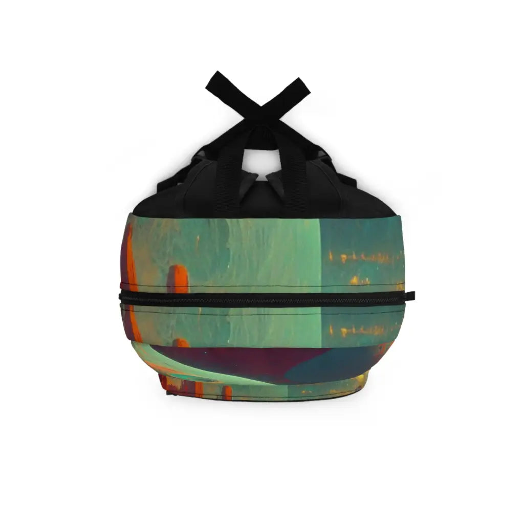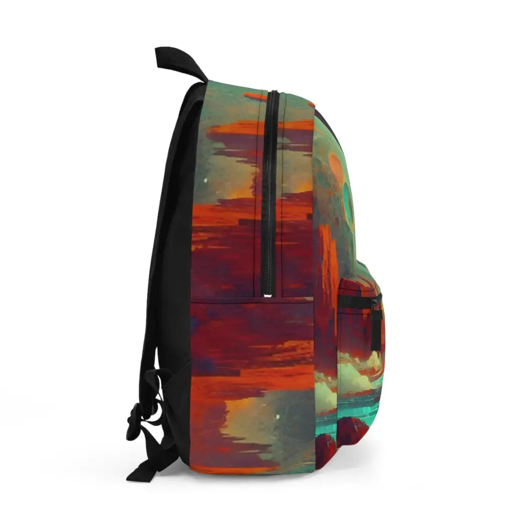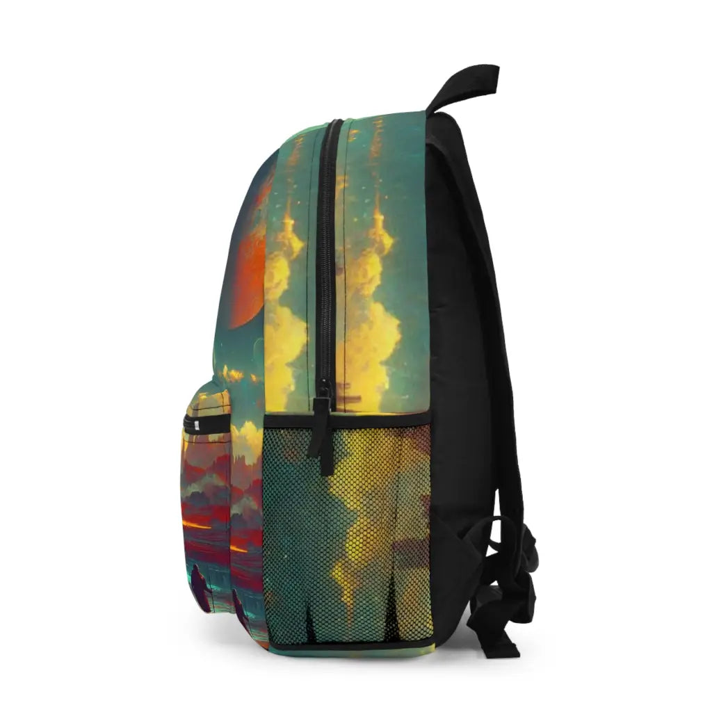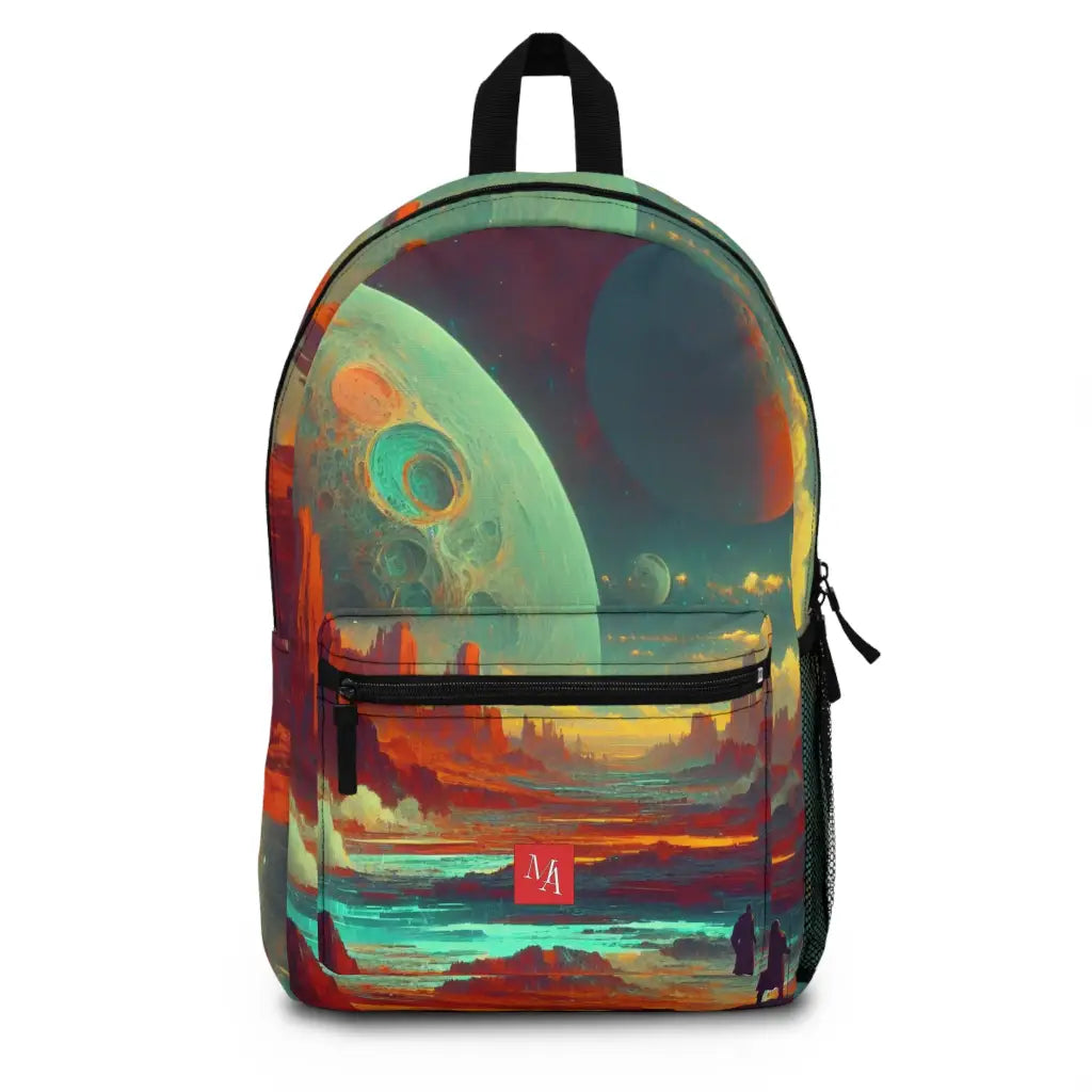 In a vivid extraterrestrial vista, two explorers overlook a surreal landscape with otherworldly rock formations and glowing, multi-hued planets. A panoramic, dreamlike atmosphere evokes endless discovery, blending cosmic beauty with a sense of awe-inspiring wonder. Introducing the ultimate backpack for fashion-forward adventurers! Our backpack boasts a striking textile design that will make a statement wherever you go. With its durable construction and spacious compartments, it is perfect for carrying all your essentials. Get ready to turn heads and stay organized with our backpack. #textiledesign #backpack #fashionforward #adventure #durable #spacious #statementpiece #organized #essentials #travel #explore