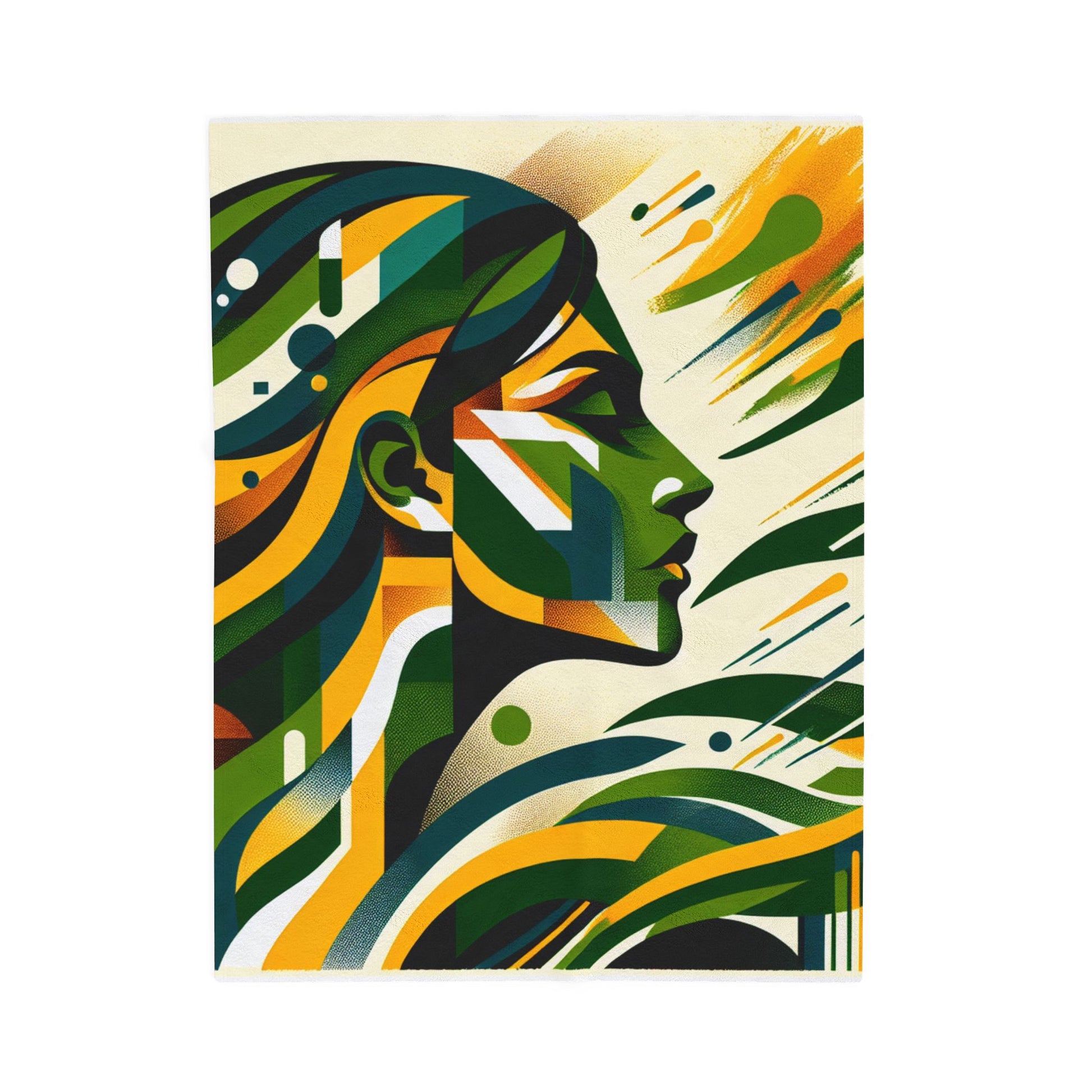Vibrant and abstract, this image features a female profile crafted from geometric shapes and dynamic lines. Rich greens, yellows, and blues interweave with energetic strokes, evoking a sense of movement and harmony. Bold and expressive, it captures the essence of artistic fluidity and creativity. Create a cozy and warm atmosphere at home with this plush velveteen blanket. It is soft to touch and perfect for any home. Customize with a one-sided print to add your personal touch or create a gift for your friends and family. Available in three sizes: 30x40", 50x60", 60x80".