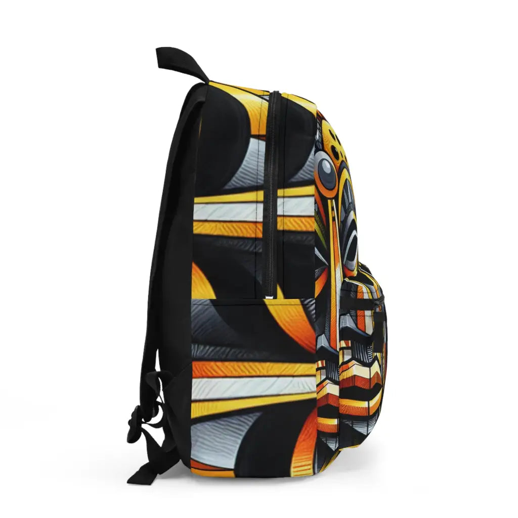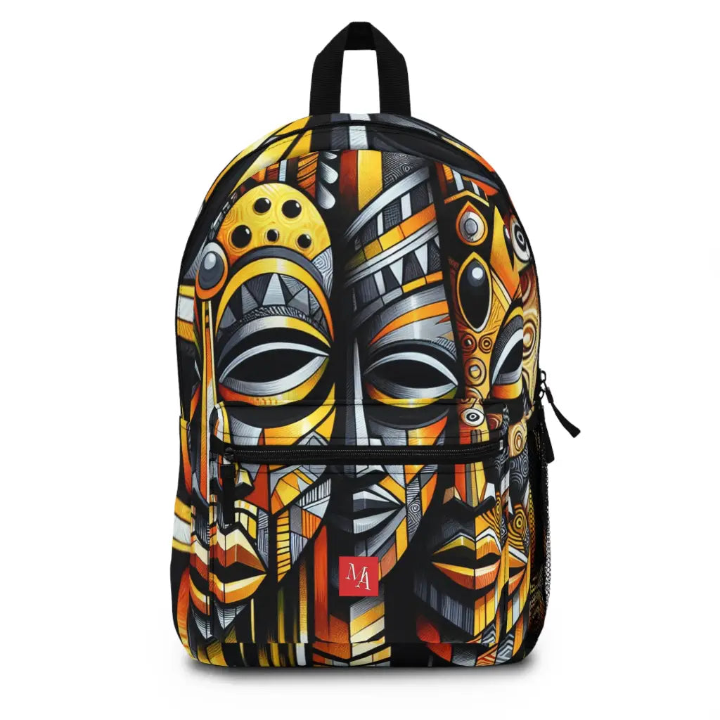A vibrant tapestry of African masks, characterized by bold earth tones and geometric lines. The layered arrangement creates depth, showcasing diverse expressions and intricate patterns, evoking cultural heritage and artistic harmony. Introducing the ultimate backpack for fashion-forward adventurers! Our backpack boasts a striking textile design that will make a statement wherever you go. With its durable construction and spacious compartments, it is perfect for carrying all your essentials. Get ready to turn heads and stay organized with our backpack. #textiledesign #backpack #fashionforward #adventure #durable #spacious #statementpiece #organized #essentials #travel #explore