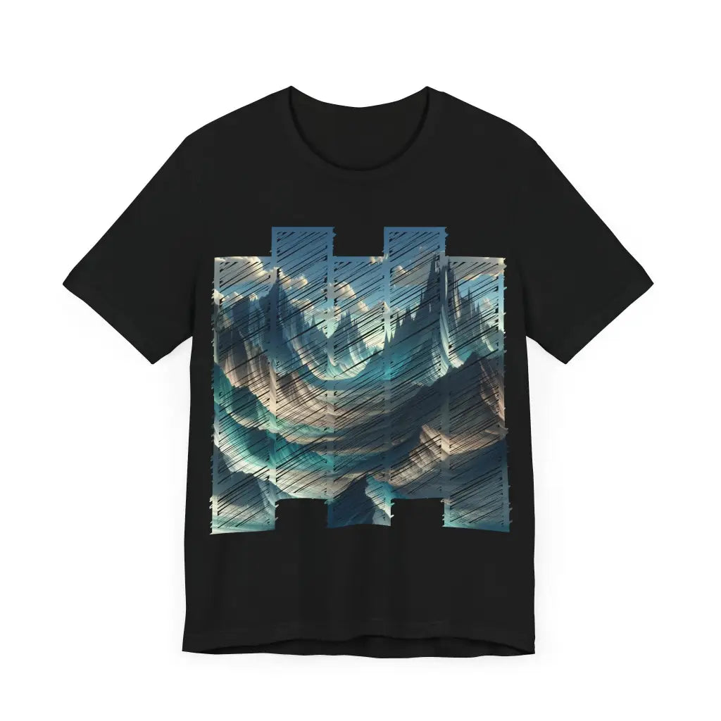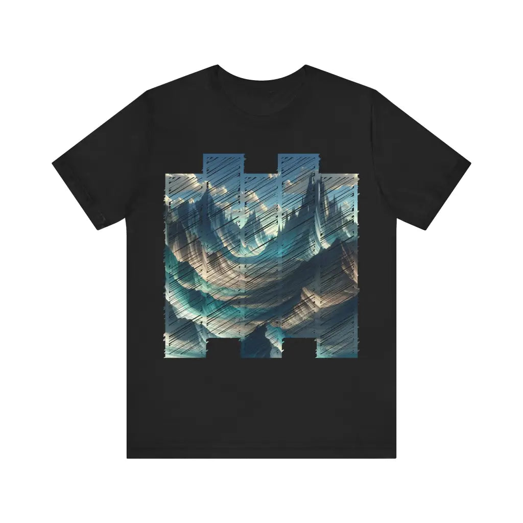 A surreal mountain landscape, intriguingly fragmented by bold diagonal slashes, blends soft teal and beige hues. The composition creates a dreamlike effect, transforming the scene into a dynamic, abstract vision, evoking a sense of movement and mystery.. This classic unisex jersey short sleeve tee fits like a well-loved favorite. Soft cotton and quality print make users fall in love with it over and over again. These t-shirts have-ribbed knit collars to bolster shaping. The shoulders are tapered for a better fit over time. Dual side seams hold the garment's shape for longer.