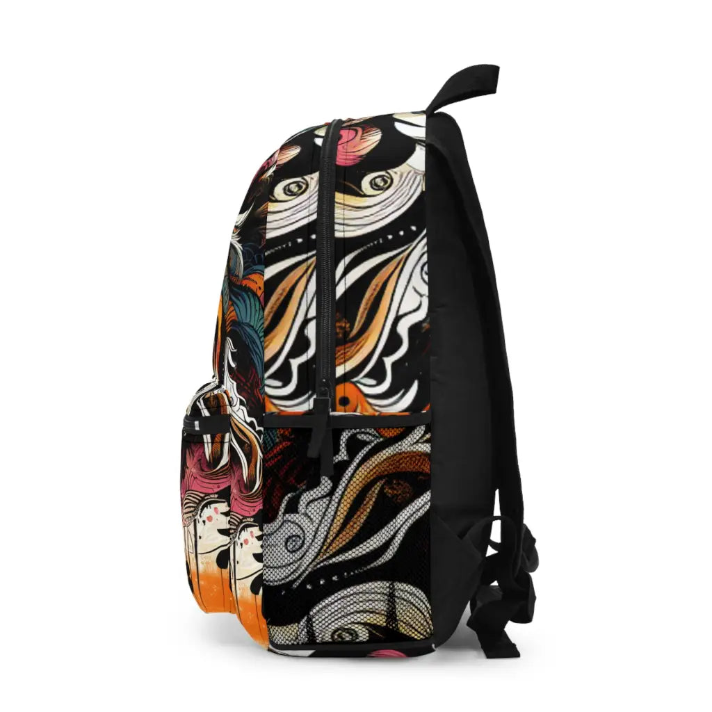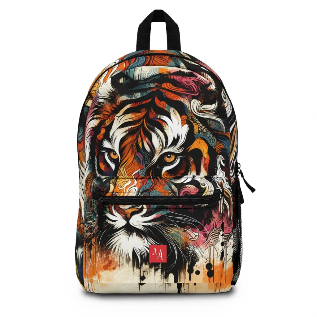 This striking artwork features a fierce tiger in vivid orange and black. The close-up detail emphasizes its intense gaze and sharp teeth. The bold, dynamic lines and traditional Asian calligraphy add a cultural and artistic flair, making it both captivating and dramatic. Introducing the ultimate backpack for fashion-forward adventurers! Our backpack boasts a striking textile design that will make a statement wherever you go. With its durable construction and spacious compartments, it is perfect for carrying all your essentials. Get ready to turn heads and stay organized with our backpack. #textiledesign #backpack #fashionforward #adventure #durable #spacious #statementpiece #organized #essentials #travel #explore