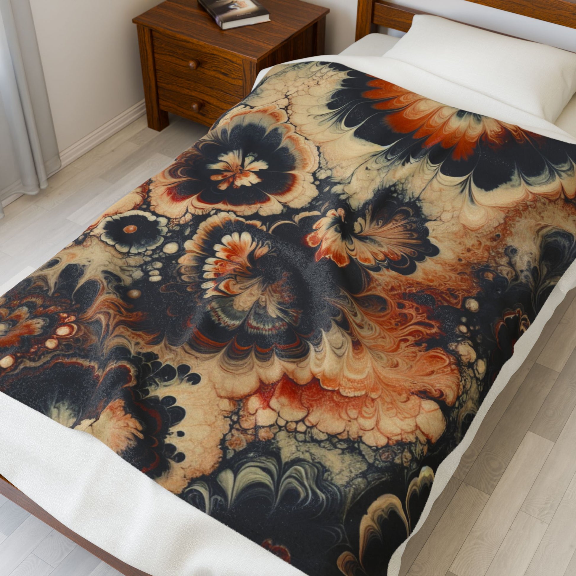 A mesmerizing fractal design blooms with intricate spirals and floral motifs. Rich earth tones blend seamlessly, creating a dynamic flow of color and texture, reminiscent of cosmic gardens or coral reefs. The image exudes an organic, yet abstract kaleidoscope of creativity. Create a cozy and warm atmosphere at home with this plush velveteen blanket. It is soft to touch and perfect for any home. Customize with a one-sided print to add your personal touch or create a gift for your friends and family. Available in three sizes: 30x40", 50x60", 60x80".