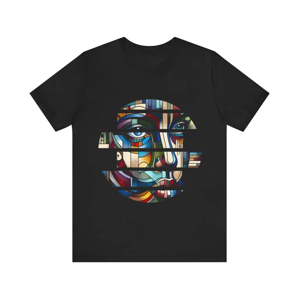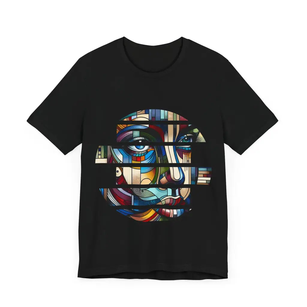 This image features a whimsical, abstract face crafted in bold geometric patterns and vibrant colors, forming a circular shape. The fragmented design creates a modern, stained glass effect that blends surrealism with vivid, dynamic creativity.. This classic unisex jersey short sleeve tee fits like a well-loved favorite. Soft cotton and quality print make users fall in love with it over and over again. These t-shirts have-ribbed knit collars to bolster shaping. The shoulders are tapered for a better fit over time. Dual side seams hold the garment's shape for longer.