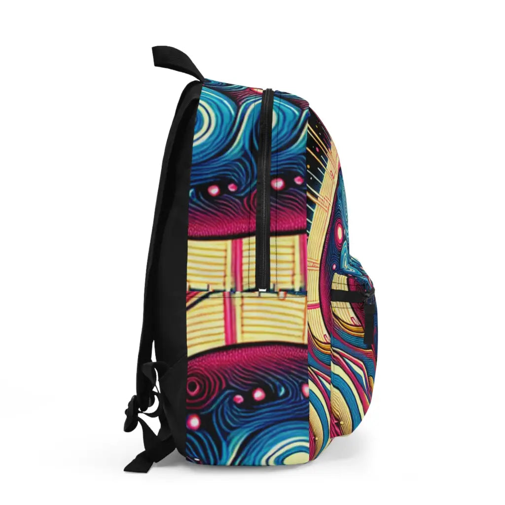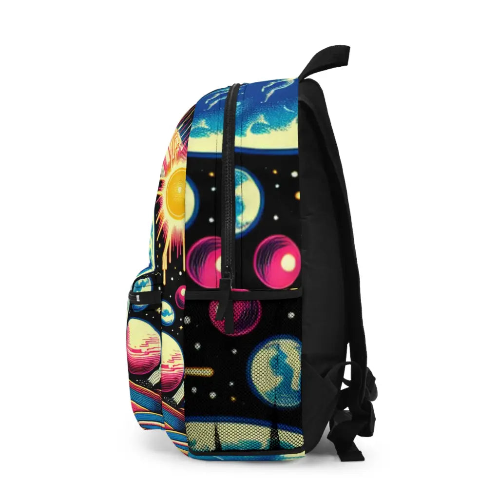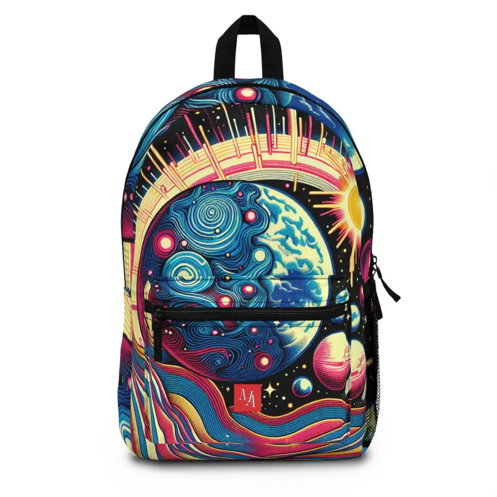 A vibrant cosmic scene features colorful planets, stars, and a wavy rainbow border on a black backdrop. This playful illustration combines abstract and celestial elements, creating a whimsical depiction of space. Introducing the ultimate backpack for fashion-forward adventurers! Our backpack boasts a striking textile design that will make a statement wherever you go. With its durable construction and spacious compartments, it is perfect for carrying all your essentials. Get ready to turn heads and stay organized with our backpack. #textiledesign #backpack #fashionforward #adventure #durable #spacious #statementpiece #organized #essentials #travel #explore