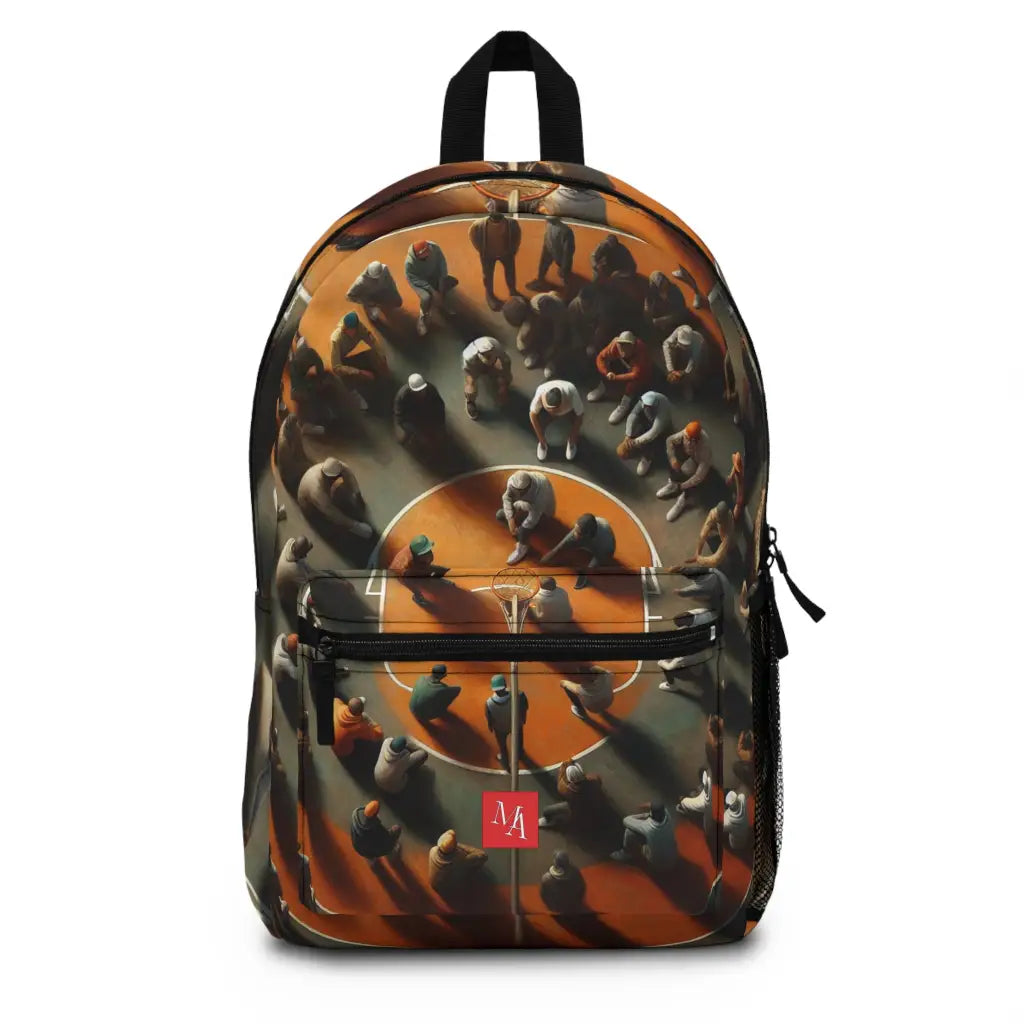 Aerial view of six individuals captured through an orange basketball hoop, forming a compelling circle. Their vibrant clothing contrasts with the muted, sepia-toned background, creating a dynamic blend of urban culture and geometric composition, while the hoop frames the scene with captivating symmetry. Introducing the ultimate backpack for fashion-forward adventurers! Our backpack boasts a striking textile design that will make a statement wherever you go. With its durable construction and spacious compartments, it is perfect for carrying all your essentials. Get ready to turn heads and stay organized with our backpack. #textiledesign #backpack #fashionforward #adventure #durable #spacious #statementpiece #organized #essentials #travel #explore