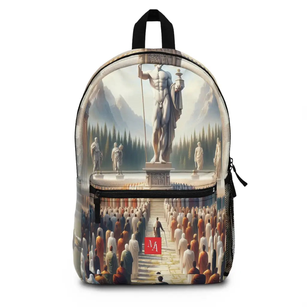 In a grand, ancient setting, colossal statues and majestic columns loom over a vast gathering of robed figures. Serenity meets grandeur as the mountains and forest form an untouched backdrop, blending classical artistry with natural beauty in timeless harmony. Introducing the ultimate backpack for fashion-forward adventurers! Our backpack boasts a striking textile design that will make a statement wherever you go. With its durable construction and spacious compartments, it is perfect for carrying all your essentials. Get ready to turn heads and stay organized with our backpack. #textiledesign #backpack #fashionforward #adventure #durable #spacious #statementpiece #organized #essentials #travel #explore