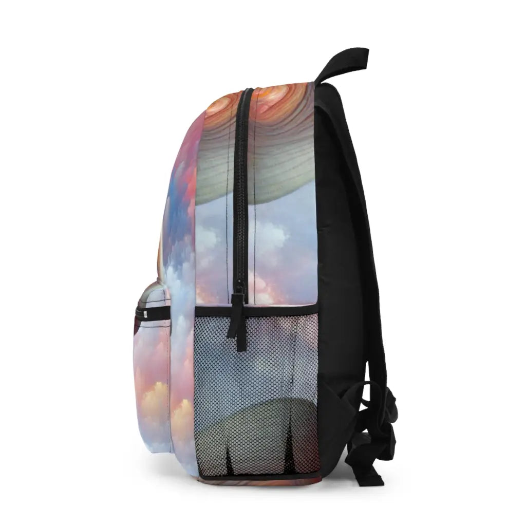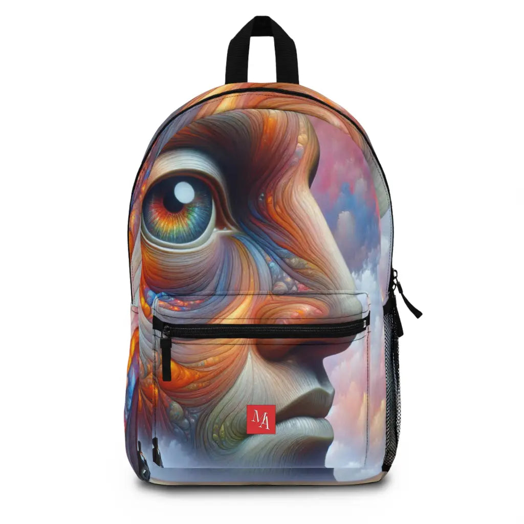 A towering, ethereal figure with a vibrant, rainbow-tinted gaze contrasts with a diminutive, monochrome silhouette. This surreal scene blends scale and color, creating a dreamlike, introspective atmosphere. Introducing the ultimate backpack for fashion-forward adventurers! Our backpack boasts a striking textile design that will make a statement wherever you go. With its durable construction and spacious compartments, it is perfect for carrying all your essentials. Get ready to turn heads and stay organized with our backpack. #textiledesign #backpack #fashionforward #adventure #durable #spacious #statementpiece #organized #essentials #travel #explore
