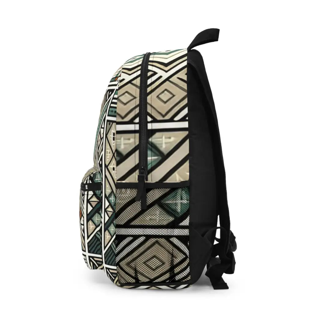 Intricate geometric patchwork of muted earth tones and teal, each square uniquely patterned with lines, dots, and shapes, creating a mesmerizing mosaic. The symphony of symmetry and abstraction forms a striking tapestry of modern artistry and mathematical beauty. Introducing the ultimate backpack for fashion-forward adventurers! Our backpack boasts a striking textile design that will make a statement wherever you go. With its durable construction and spacious compartments, it is perfect for carrying all your essentials. Get ready to turn heads and stay organized with our backpack. #textiledesign #backpack #fashionforward #adventure #durable #spacious #statementpiece #organized #essentials #travel #explore