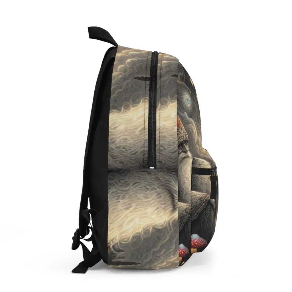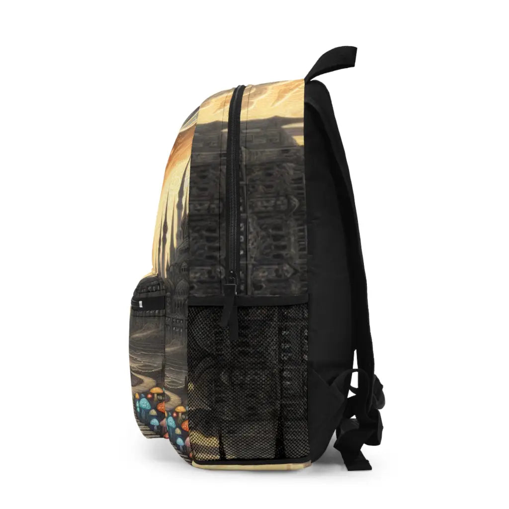 In a vibrant fantasy landscape, a whimsical gnome gazes at a glowing castle surrounded by luminescent mushrooms and ethereal butterflies. The sky swirls with iridescent colors, forming a magical, dreamlike atmosphere. Introducing the ultimate backpack for fashion-forward adventurers! Our backpack boasts a striking textile design that will make a statement wherever you go. With its durable construction and spacious compartments, it is perfect for carrying all your essentials. Get ready to turn heads and stay organized with our backpack. #textiledesign #backpack #fashionforward #adventure #durable #spacious #statementpiece #organized #essentials #travel #explore