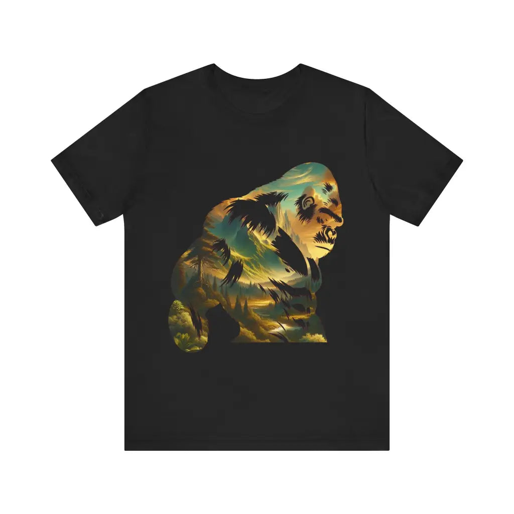 A gorilla silhouette reveals a vibrant landscape within, blending wild nature with imaginative artistry. The intricate forest scene and dynamic sky illustrate a harmonious fusion of wildlife and environment, creating a captivating duality that draws viewers into its enchanting depth.. This classic unisex jersey short sleeve tee fits like a well-loved favorite. Soft cotton and quality print make users fall in love with it over and over again. These t-shirts have-ribbed knit collars to bolster shaping. The shoulders are tapered for a better fit over time. Dual side seams hold the garment's shape for longer.