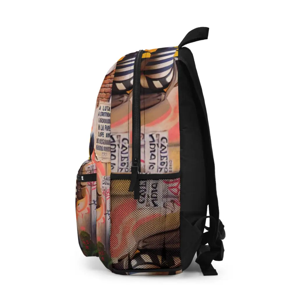 This vibrant image showcases two figures creatively painting graffiti on a brick wall. The lively colors and bold designs, including flowers and character outlines, celebrate urban street art and teamwork. Their dynamic poses and the texture of the bricks add depth and energy to the scene. Introducing the ultimate backpack for fashion-forward adventurers! Our backpack boasts a striking textile design that will make a statement wherever you go. With its durable construction and spacious compartments, it is perfect for carrying all your essentials. Get ready to turn heads and stay organized with our backpack. #textiledesign #backpack #fashionforward #adventure #durable #spacious #statementpiece #organized #essentials #travel #explore