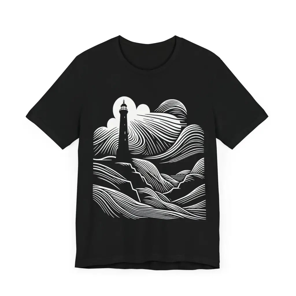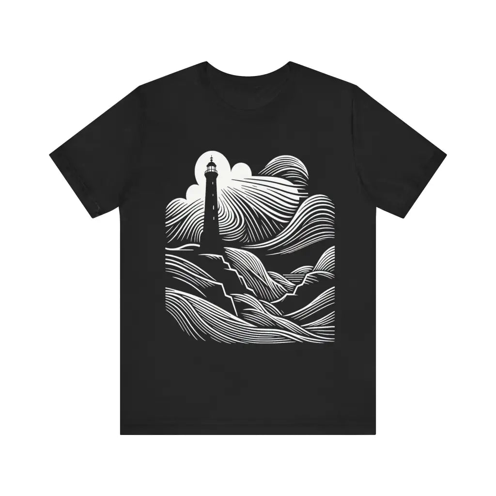 Boldly stylized in black and white, this image depicts a lighthouse amidst dynamic, swirling waves. The intricate, flowing lines evoke movement, complementing the stark contrast of the lighthouse silhouette against a luminous sky, creating a vivid sense of drama and motion.. This classic unisex jersey short sleeve tee fits like a well-loved favorite. Soft cotton and quality print make users fall in love with it over and over again. These t-shirts have-ribbed knit collars to bolster shaping. The shoulders are tapered for a better fit over time. Dual side seams hold the garment's shape for longer.