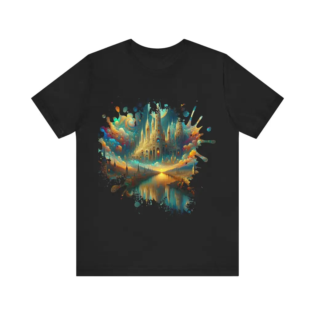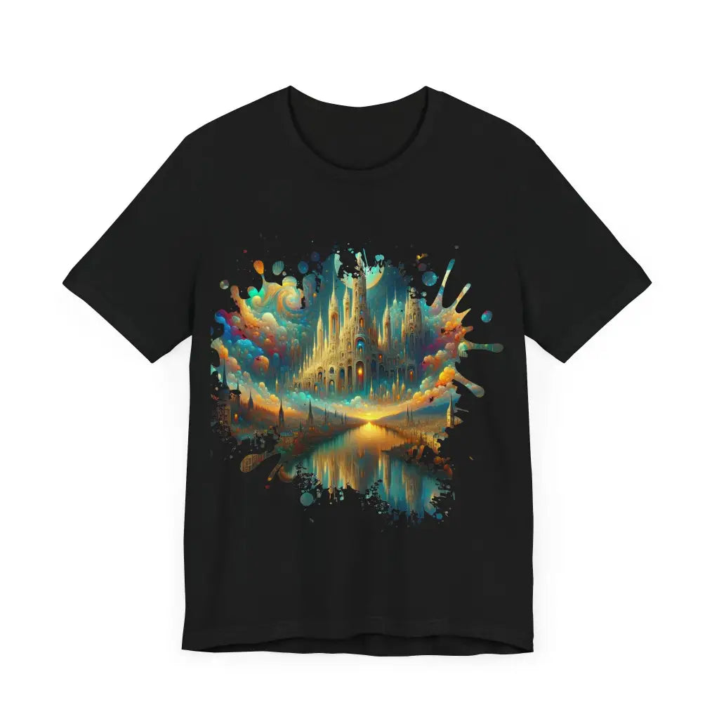 A celestial city merges with dreamy cloudscapes under a mystical moon, mirroring its splendor in an endless river. Vivid swirls of color create a surreal, ethereal world where architecture and imagination intertwine, evoking an otherworldly fantasy.. This classic unisex jersey short sleeve tee fits like a well-loved favorite. Soft cotton and quality print make users fall in love with it over and over again. These t-shirts have-ribbed knit collars to bolster shaping. The shoulders are tapered for a better fit over time. Dual side seams hold the garment's shape for longer.