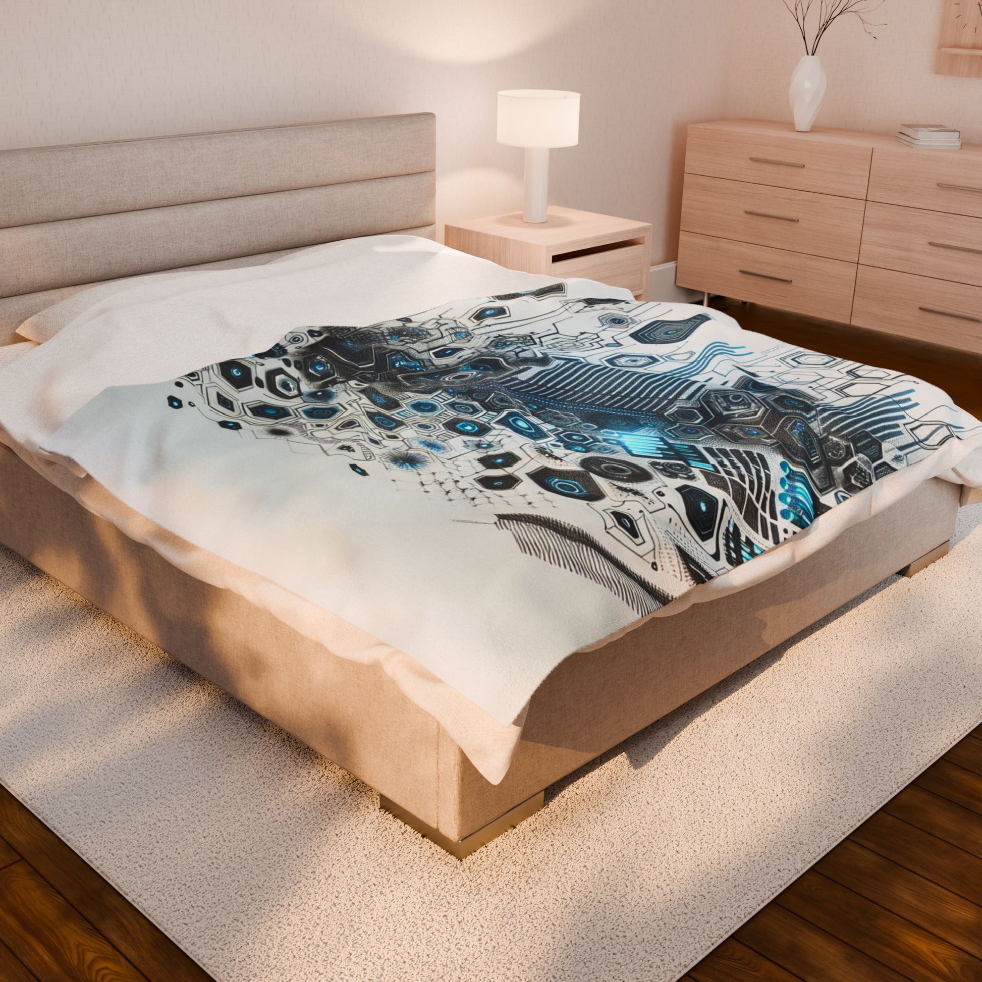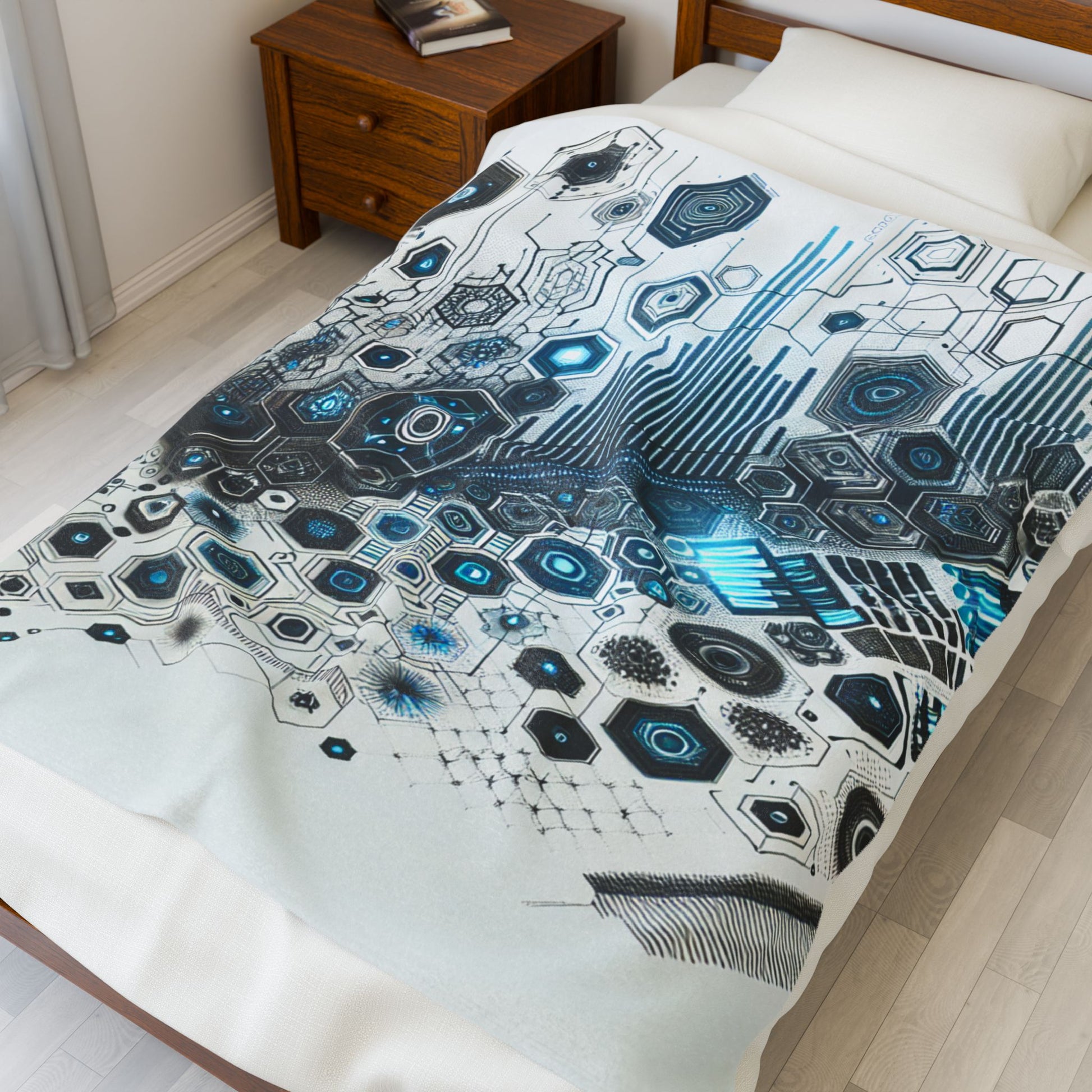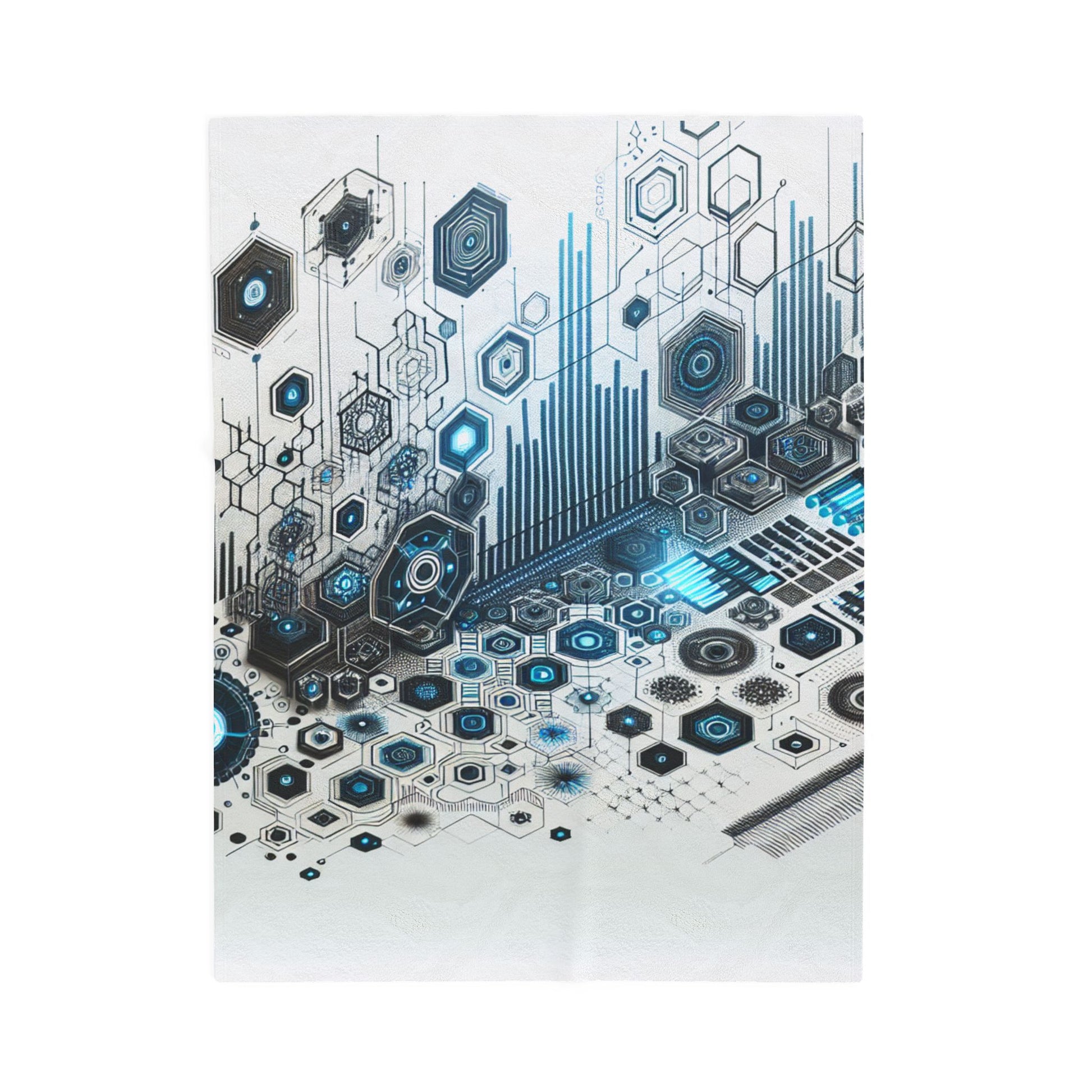 A futuristic tapestry of interconnected hexagons and luminous circuits, evoking a cybernetic landscape. Electric blues and blacks blend seamlessly into a complex, dynamic matrix, suggesting infinite data flow and technological evolution. Create a cozy and warm atmosphere at home with this plush velveteen blanket. It is soft to touch and perfect for any home. Customize with a one-sided print to add your personal touch or create a gift for your friends and family. Available in three sizes: 30x40", 50x60", 60x80".