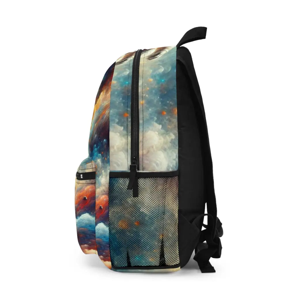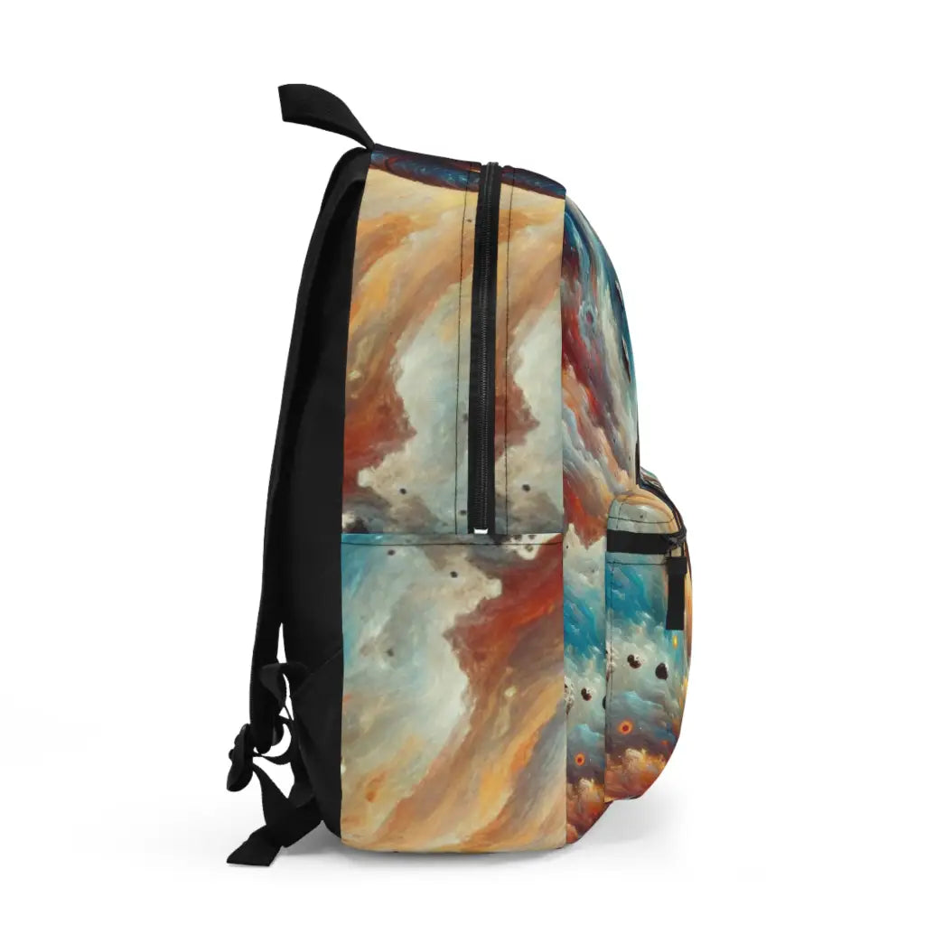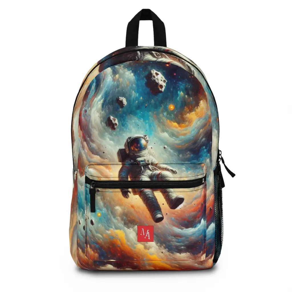 This vibrant artwork features an astronaut floating amidst a cosmic explosion of colors and abstract forms. The dynamic blend of blues, oranges, and pinks creates a surreal, dreamlike space scene, emphasizing exploration and the infinite possibilities of the universe. Introducing the ultimate backpack for fashion-forward adventurers! Our backpack boasts a striking textile design that will make a statement wherever you go. With its durable construction and spacious compartments, it is perfect for carrying all your essentials. Get ready to turn heads and stay organized with our backpack. #textiledesign #backpack #fashionforward #adventure #durable #spacious #statementpiece #organized #essentials #travel #explore