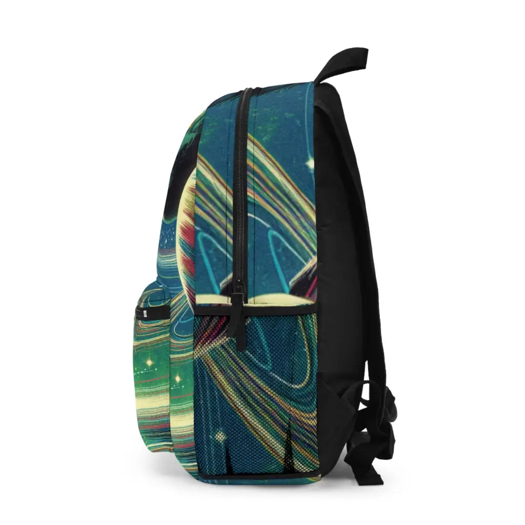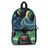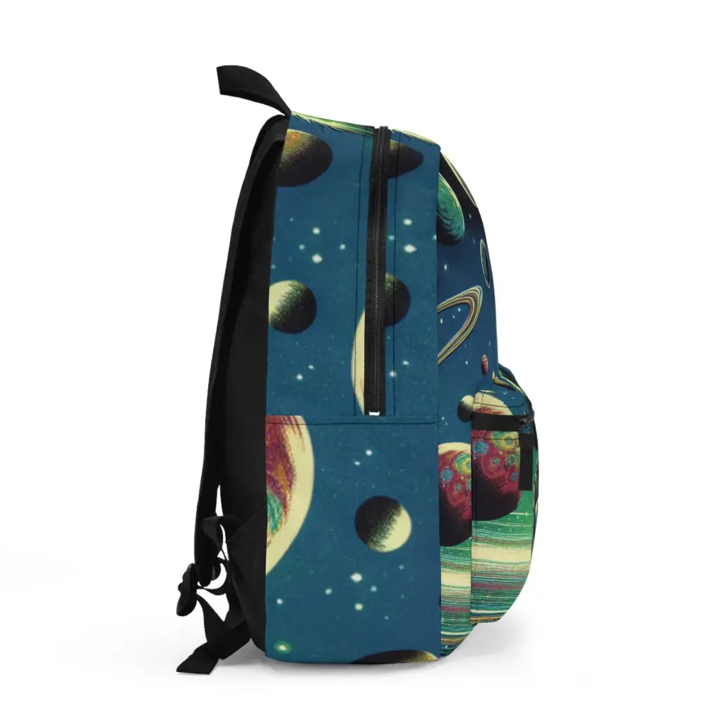 A whimsical scene of a child standing on a swirling, multicolored planet, backpack on, gazing into a vibrant cosmos filled with planets and stars. This imaginative artwork blends adventure and wonder, capturing the vastness of space through a curious, youthful perspective. Introducing the ultimate backpack for fashion-forward adventurers! Our backpack boasts a striking textile design that will make a statement wherever you go. With its durable construction and spacious compartments, it is perfect for carrying all your essentials. Get ready to turn heads and stay organized with our backpack. #textiledesign #backpack #fashionforward #adventure #durable #spacious #statementpiece #organized #essentials #travel #explore