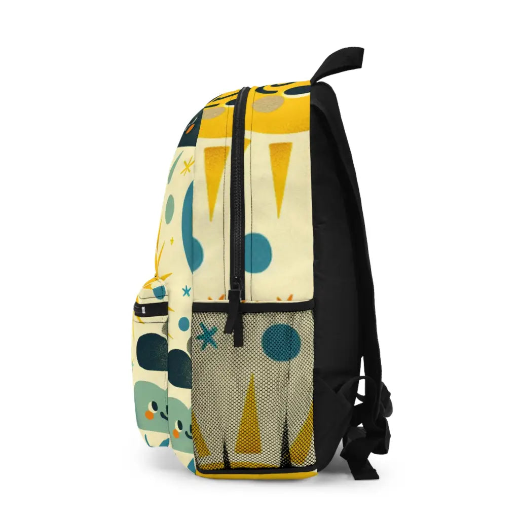 Whimsical pattern features cheerful suns, fluffy clouds, and colorful rainbows, each with quirky faces and stick-figure limbs. The playful, repeating design offers a charming and imaginative blend of weather elements on a soft beige canvas, perfect for brightening any space. Introducing the ultimate backpack for fashion-forward adventurers! Our backpack boasts a striking textile design that will make a statement wherever you go. With its durable construction and spacious compartments, it is perfect for carrying all your essentials. Get ready to turn heads and stay organized with our backpack. #textiledesign #backpack #fashionforward #adventure #durable #spacious #statementpiece #organized #essentials #travel #explore